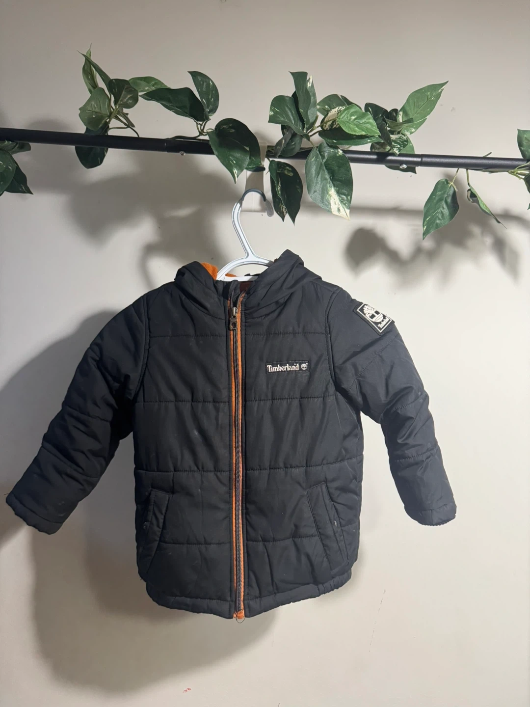 This Timberland puffer jacket is black with an orange zipper. It's a warm and durable option for cooler weather. Features a hood and two front pockets.