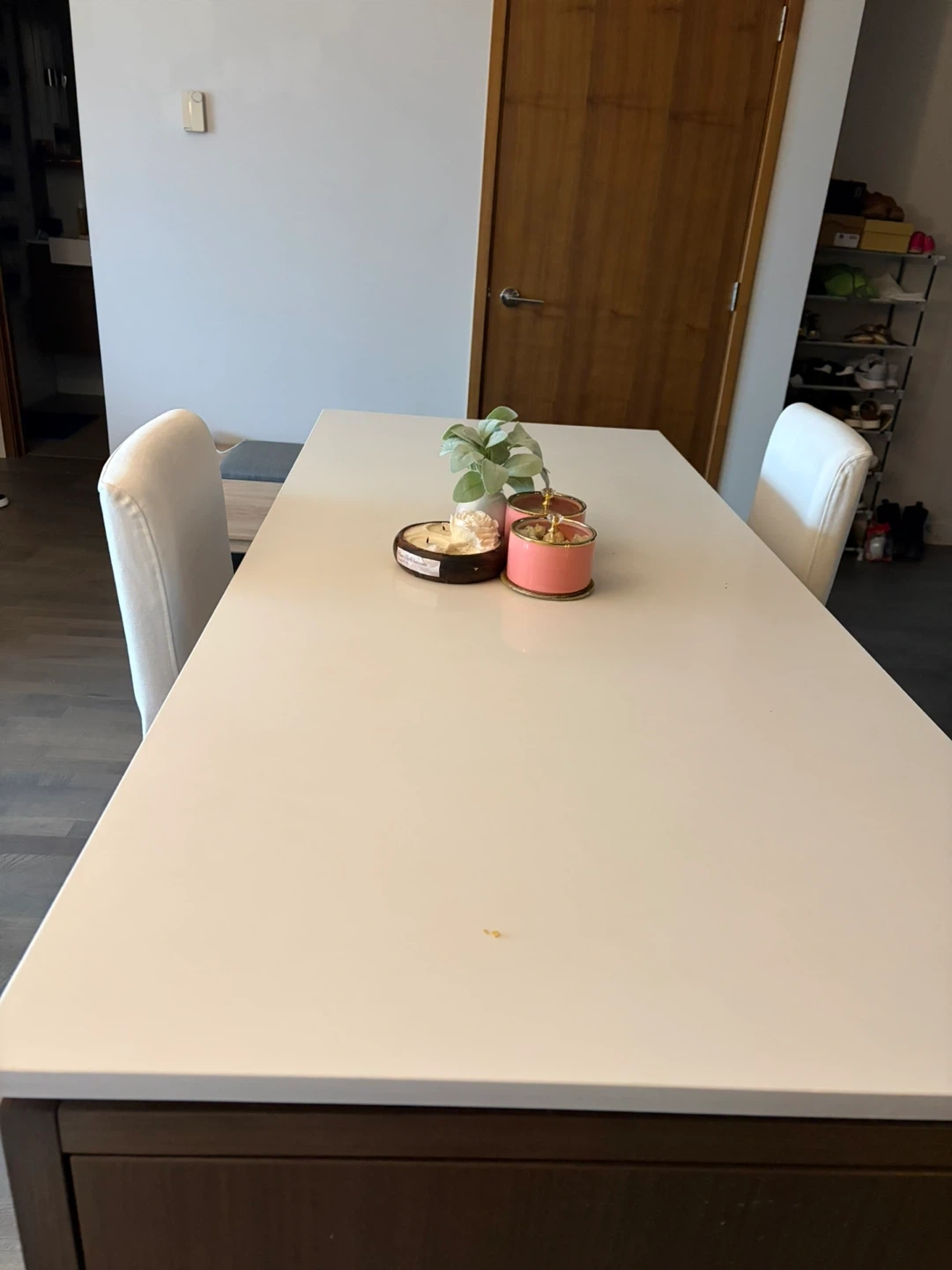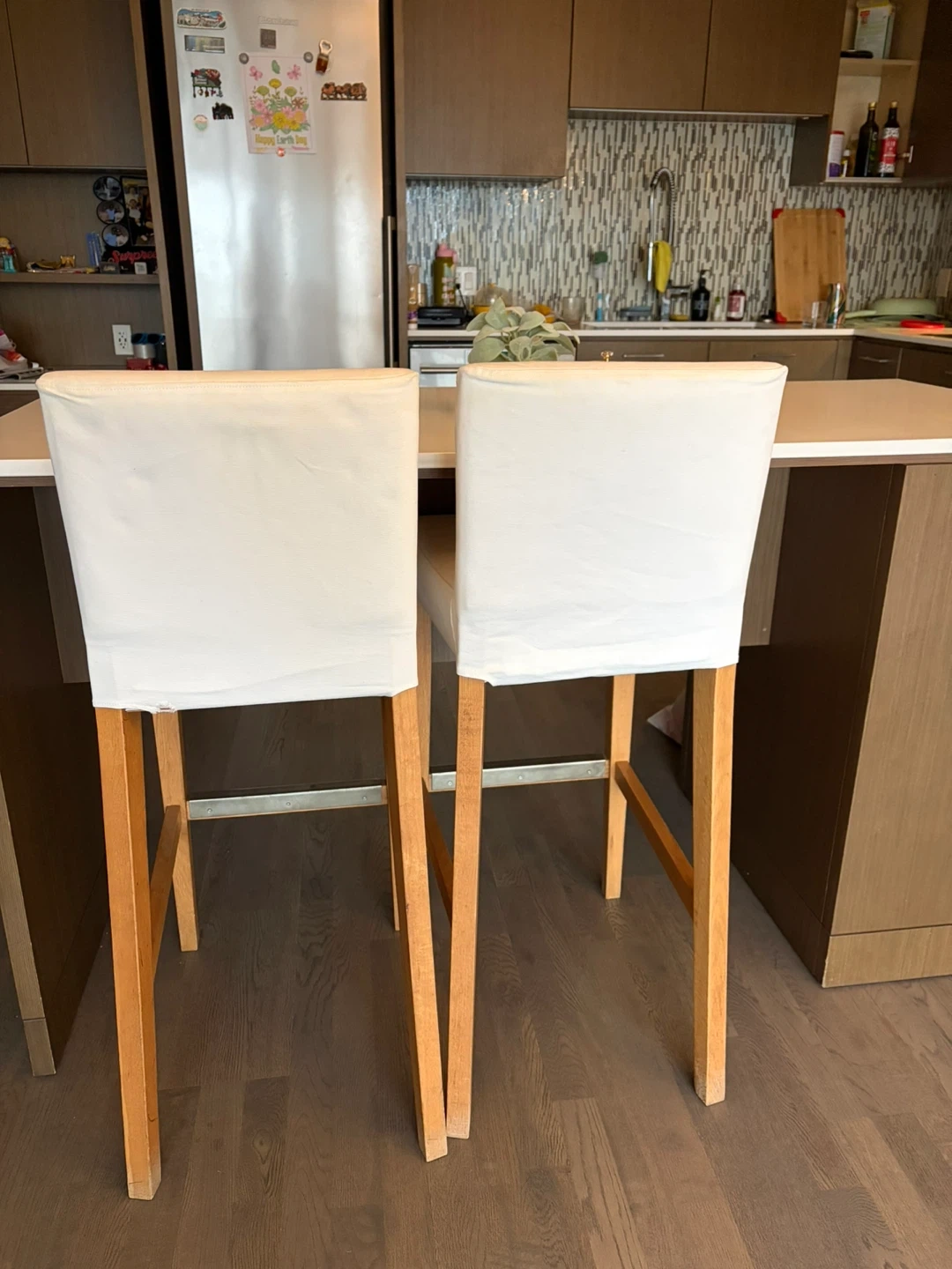 A set of two white bar high chairs with wooden legs. These stools are perfect for a kitchen island or counter. They're made with a durable white fabric and sturdy wooden frames.