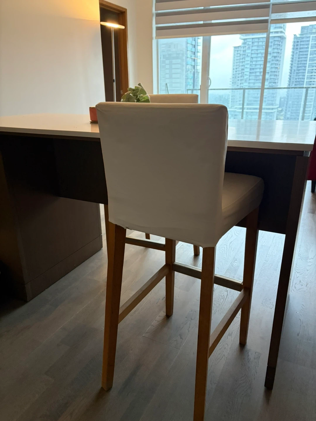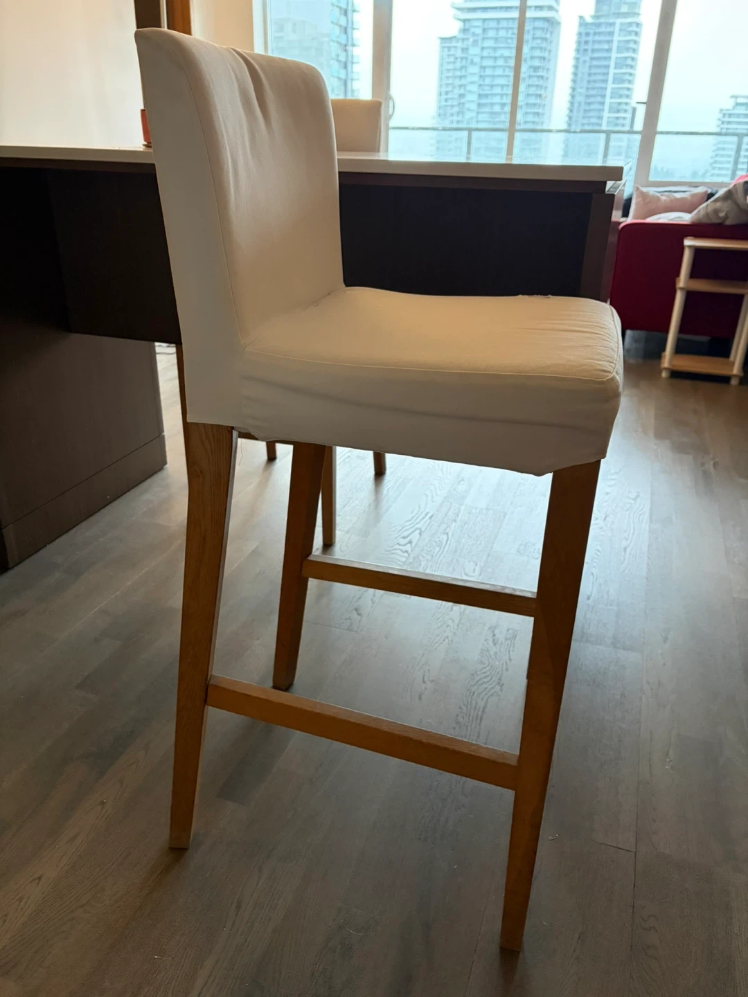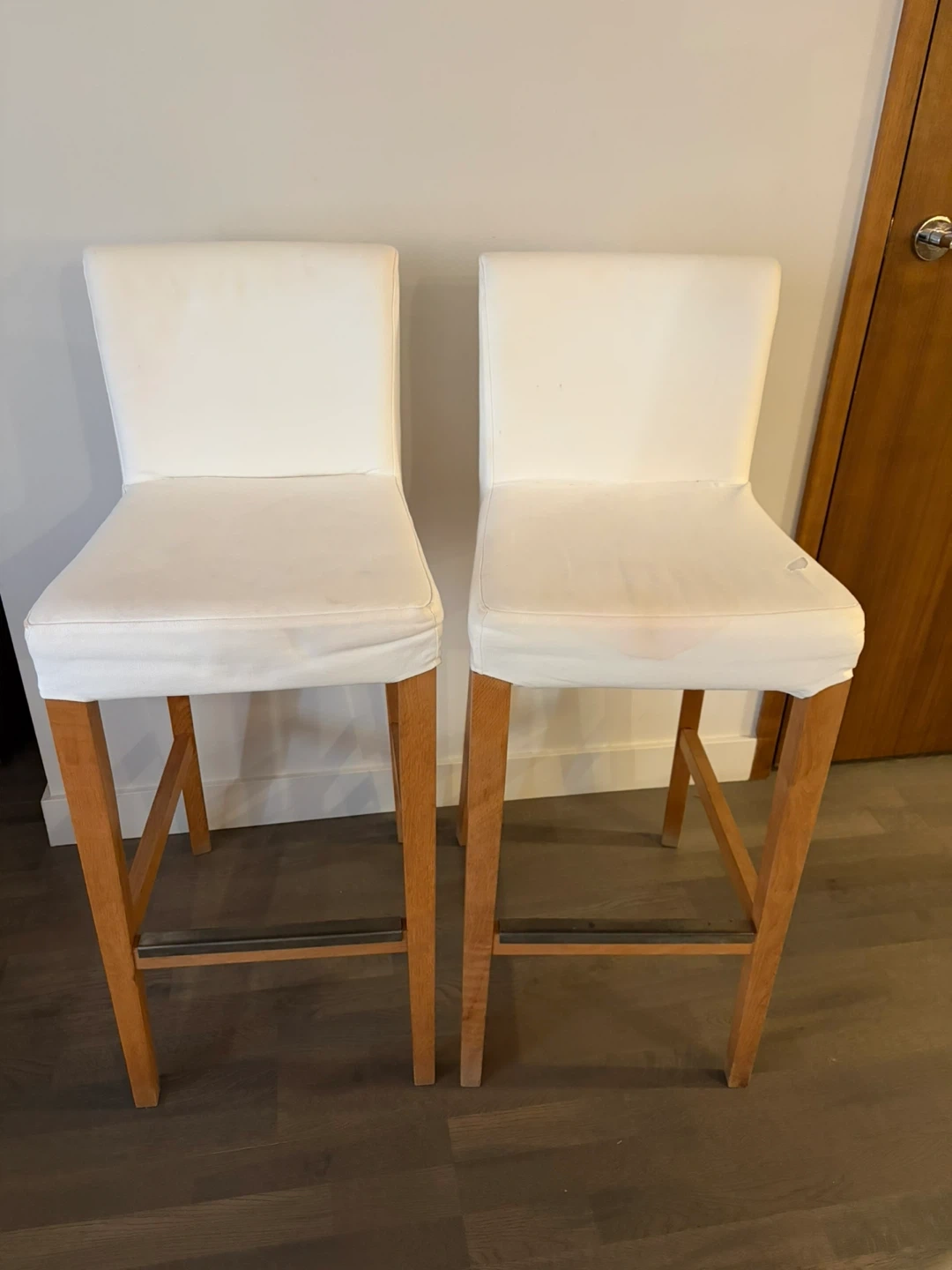 A set of two white bar high chairs with wooden legs. These stools are perfect for a kitchen island or counter. They're made with a durable white fabric and sturdy wooden frames.