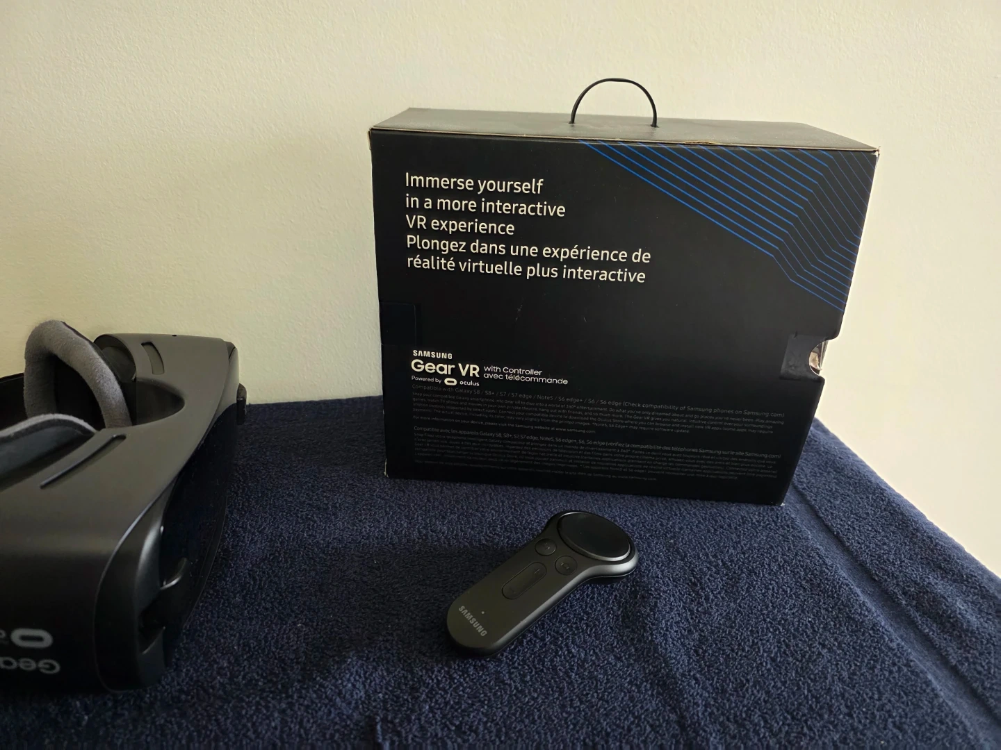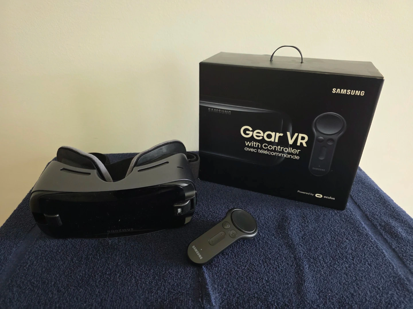 Samsung Gear VR virtual reality headset. Includes the original controller and box. Powered by Oculus technology.