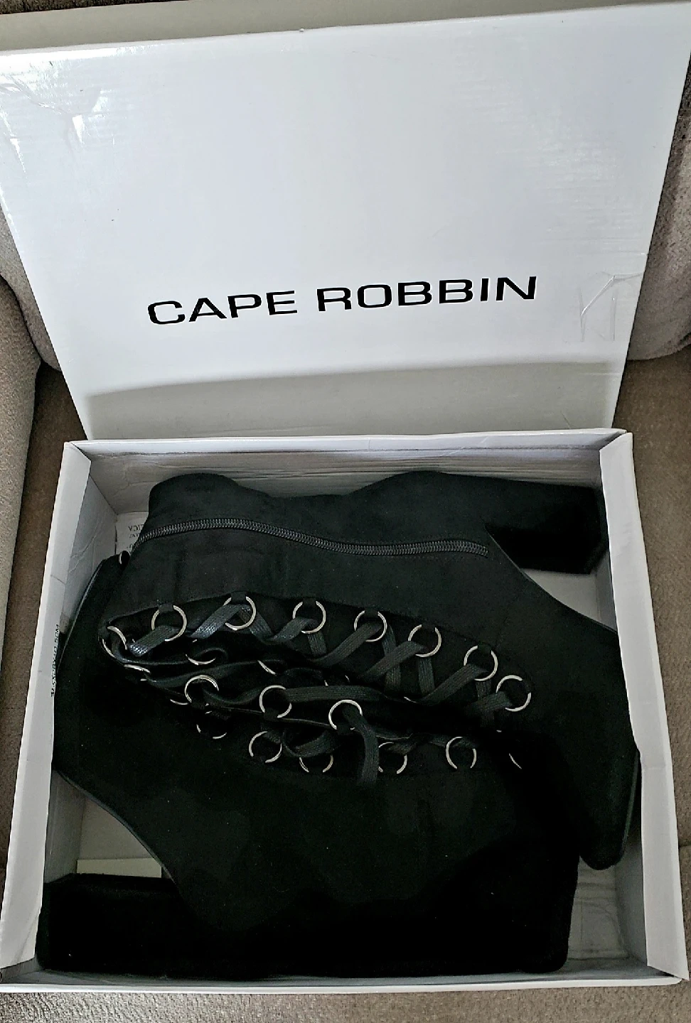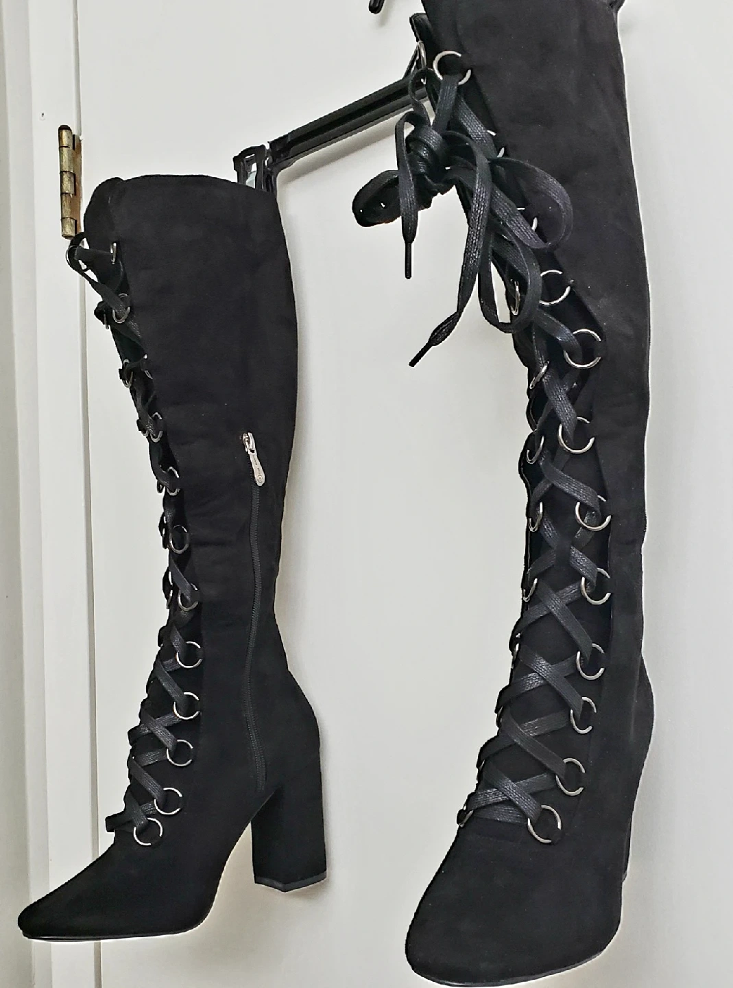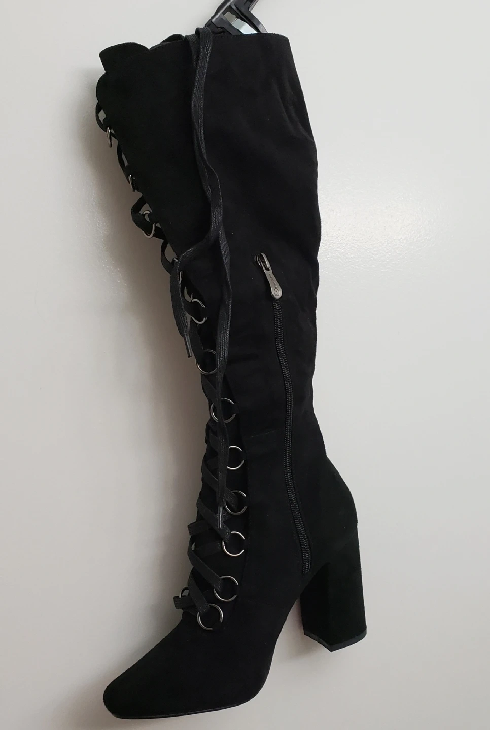 10Beautiful dark black faux suede knee high boots, size 8, brand new never worn, come in original box, comfortable chunk heel, lace up with a side zipper so they fit ANY size calf, beautiful hardware aswell. Sexy, beautiful and comfortable! would make a really nice gift. boots, sexy, beautiful, knee high, comfortable, women's, black, faux suede