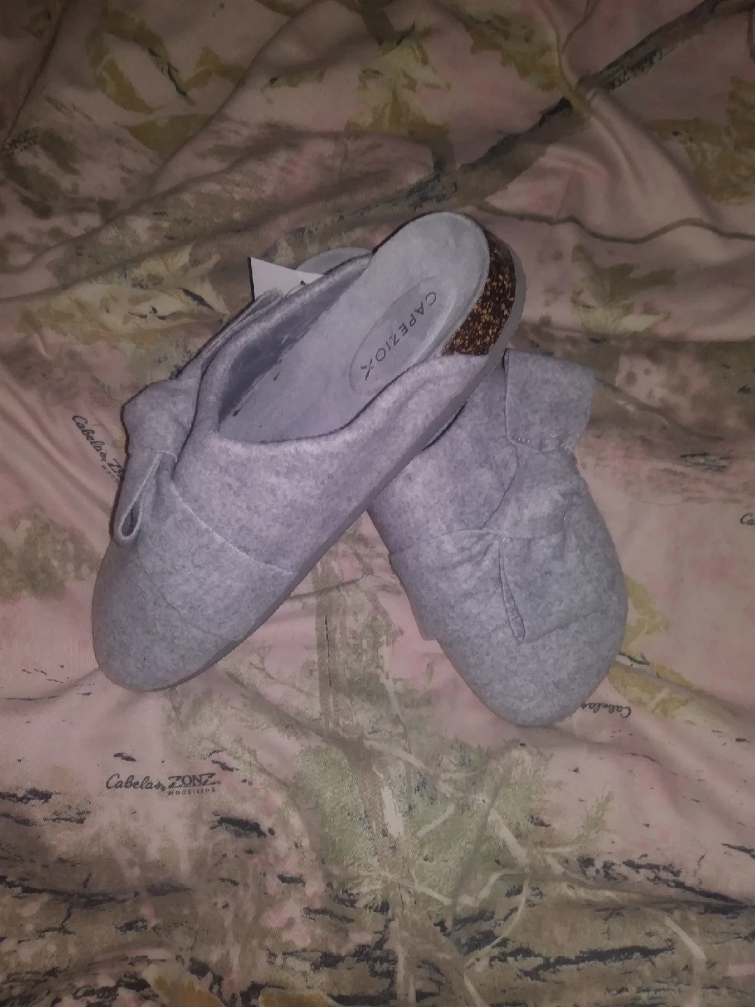 Selling a pair of Capezio slippers in a soft gray colour! They look to be about a size 7. These slippers are in great condition and ready for a new home. Perfect for keeping your feet cozy around the house!