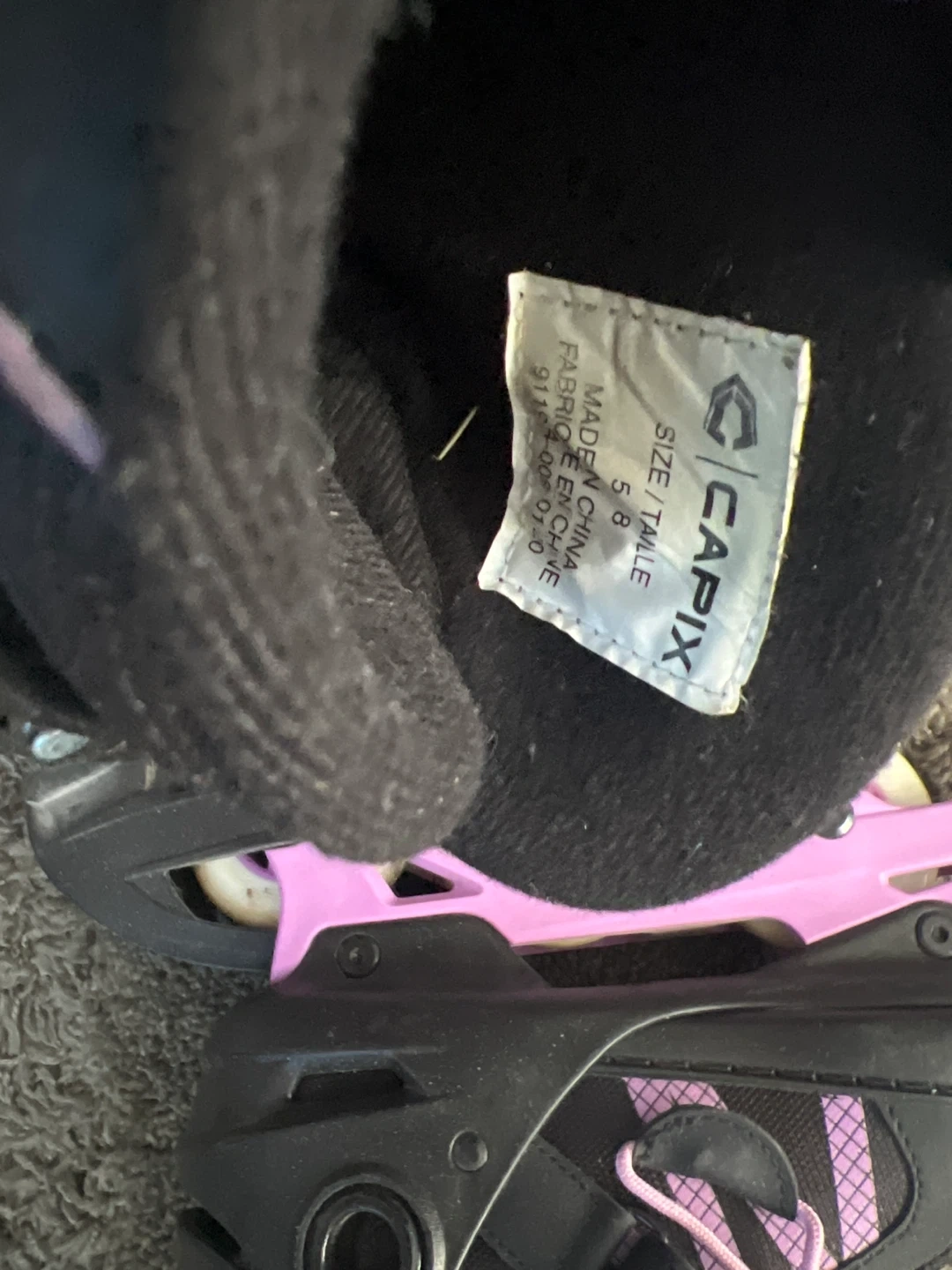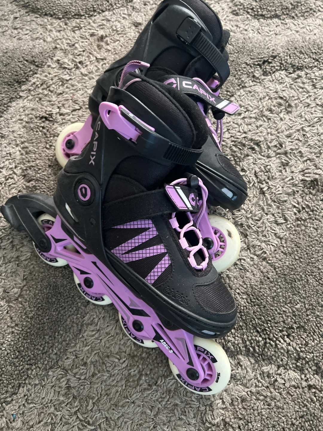 Selling a pair of Capix inline roller blades in black and purple! They're in great shape and ready for some fun. The size is 5/6.