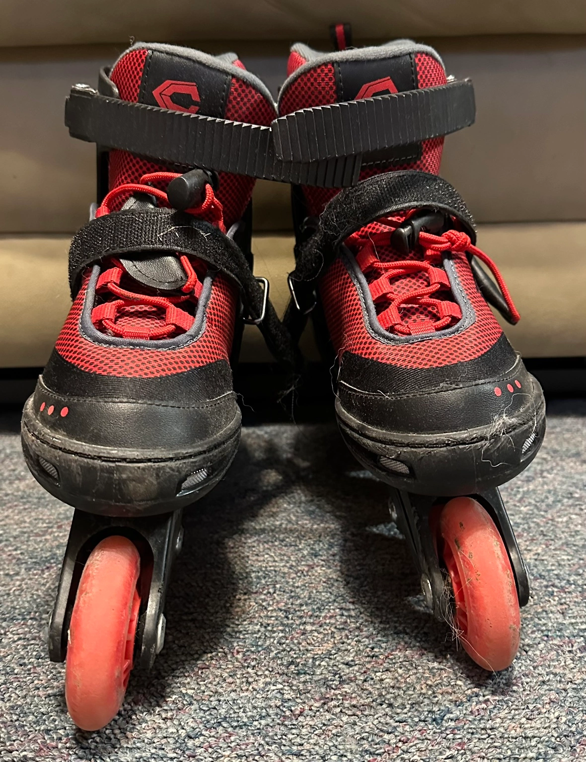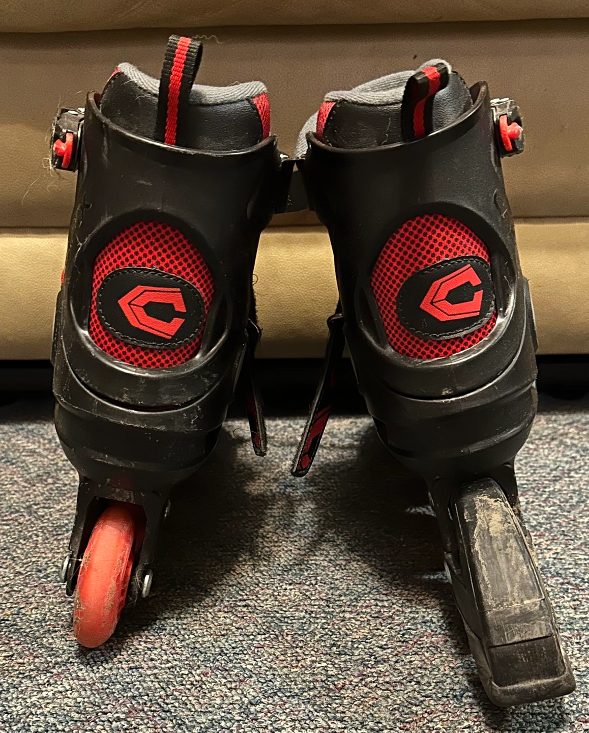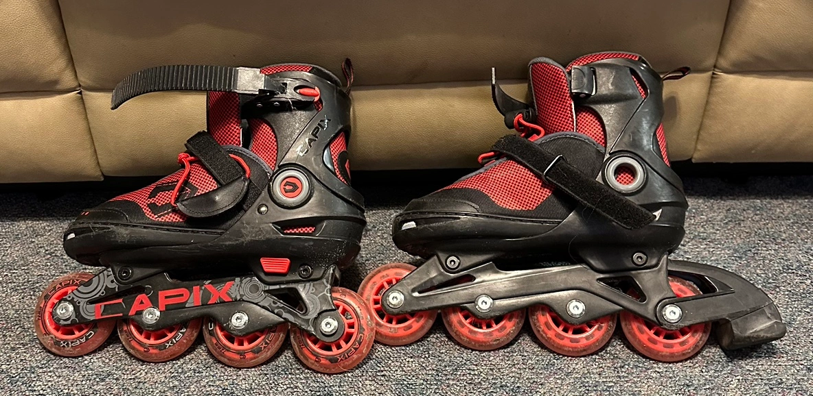 Inline skates in black and red. They have a velcro strap, a buckle, and laces to secure them to your feet. The wheels are red. They are in like new condition. Please refer to photos for size and details. Pick up in North Kildonan. Please email or text. From a dog loving home.