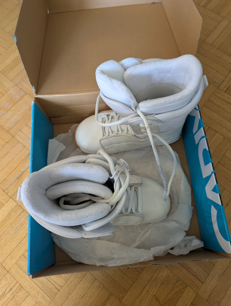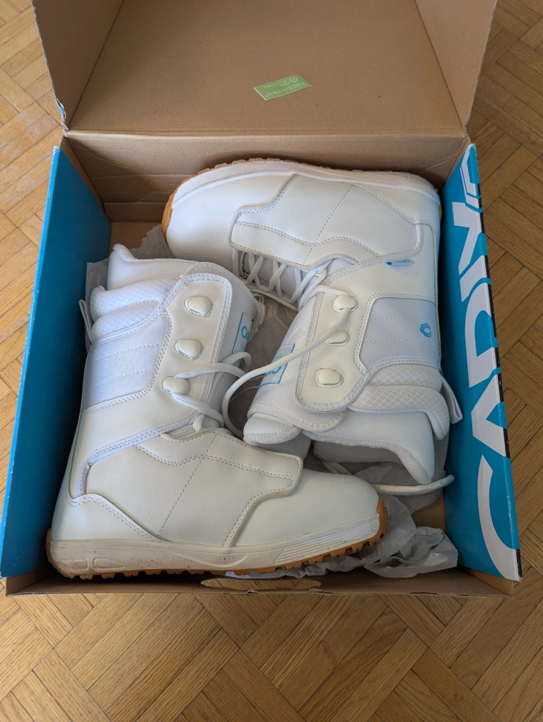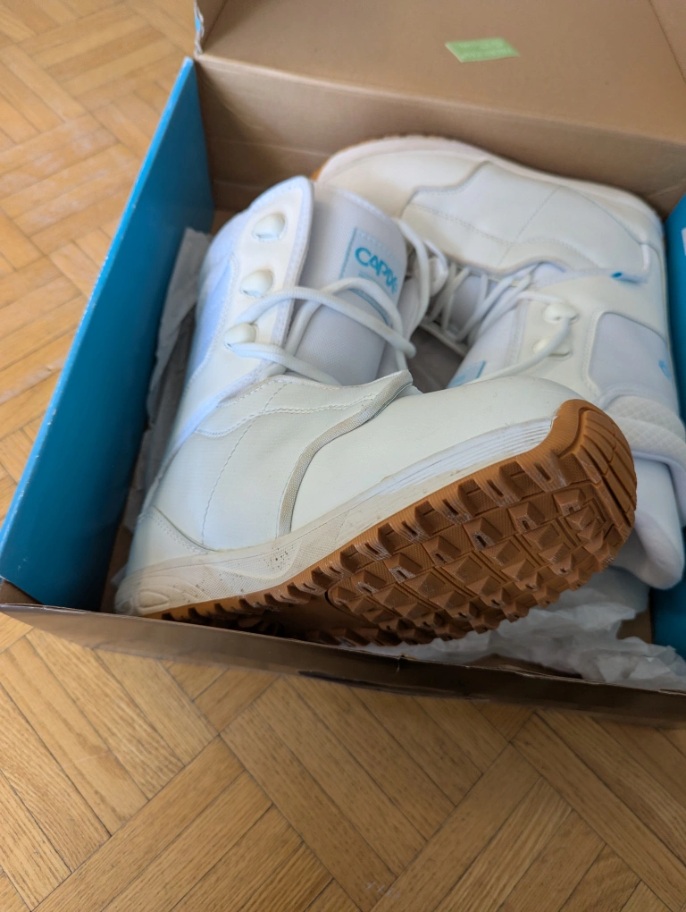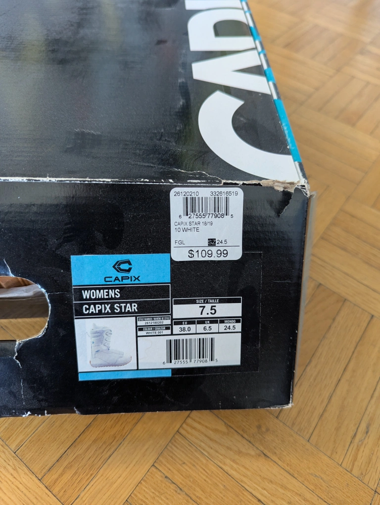 Selling a pair of women's Capix Star snowboard boots in white. They are a size 7.5 and come with the original box. Originally bought for $109.99.
