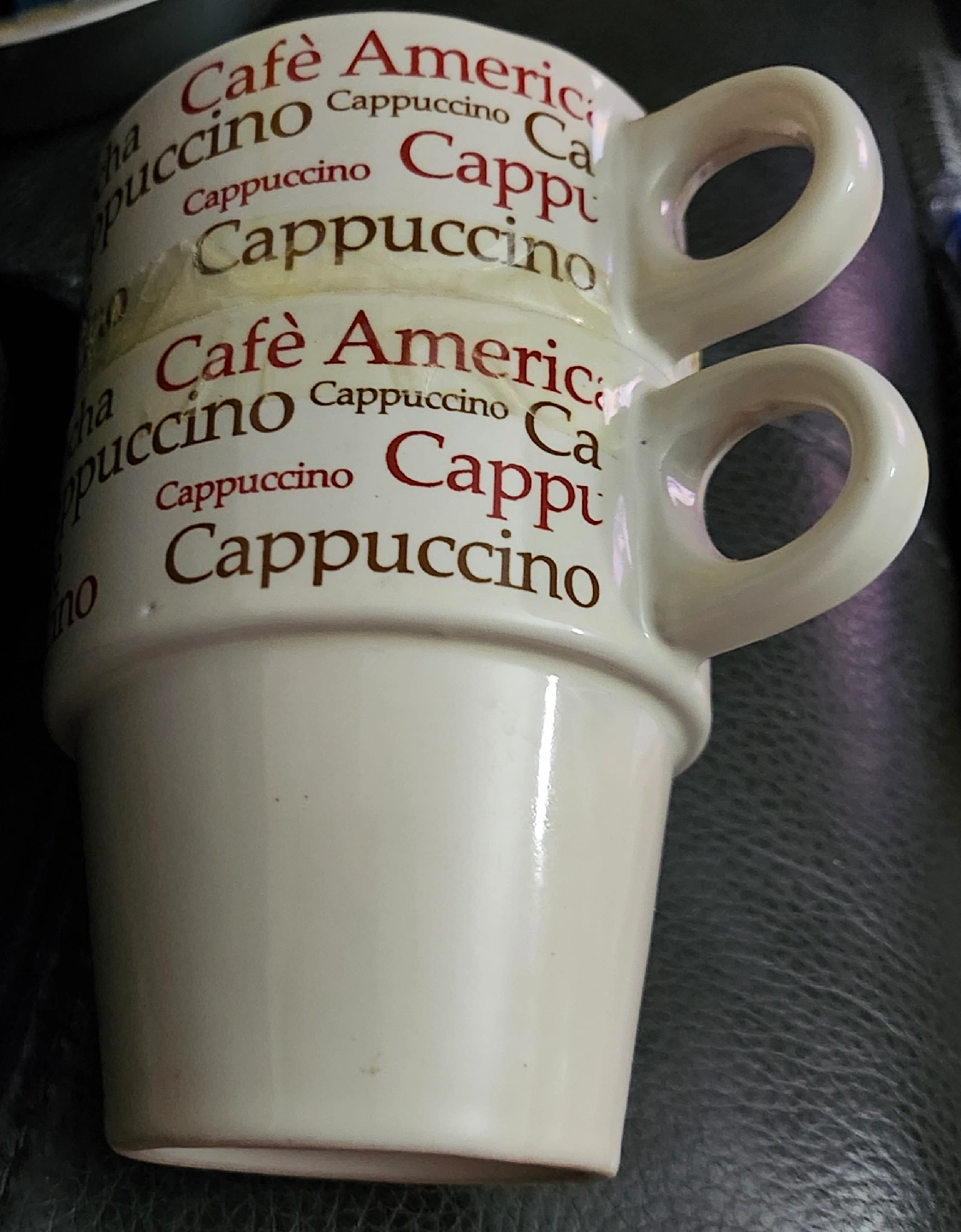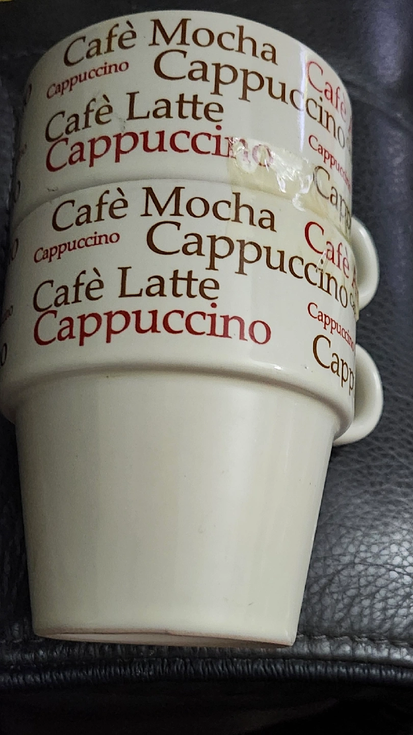 Two cute mugs perfect for your morning coffee! They feature different coffee names like Cafe Americano, Cappuccino, Cafe Mocha, and Cafe Latte in a stylish font. They're in great condition and ready for a new home. new still in package sealed