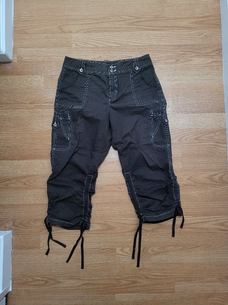 23Selling a pair of brown capri cargo pants in size 8. Great for casual wear! They feature a comfortable fit and stylish design with cargo pockets and adjustable ties at the hem