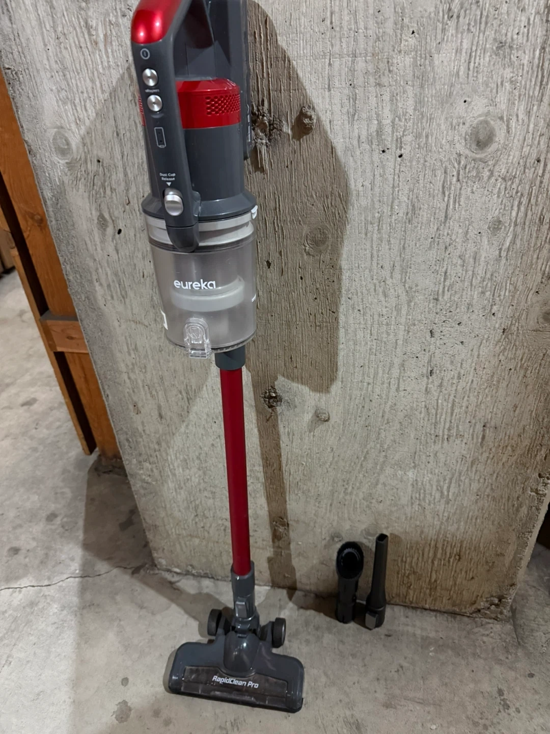 Eureka stick vacuum cleaner in grey and red. Includes crevice tool and brush nozzle. It's a lightweight, cordless design for easy use.