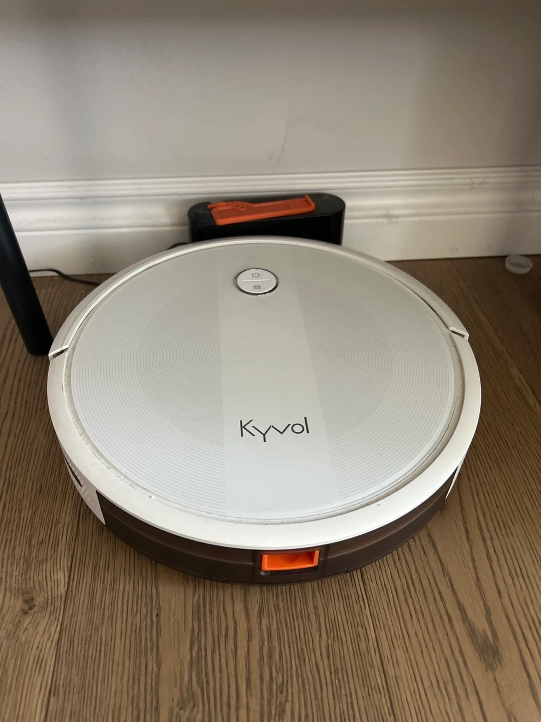 This is a white and brown Kyvol robot vacuum cleaner. It's designed for automatic floor cleaning. It operates wirelessly and comes with a charging dock.