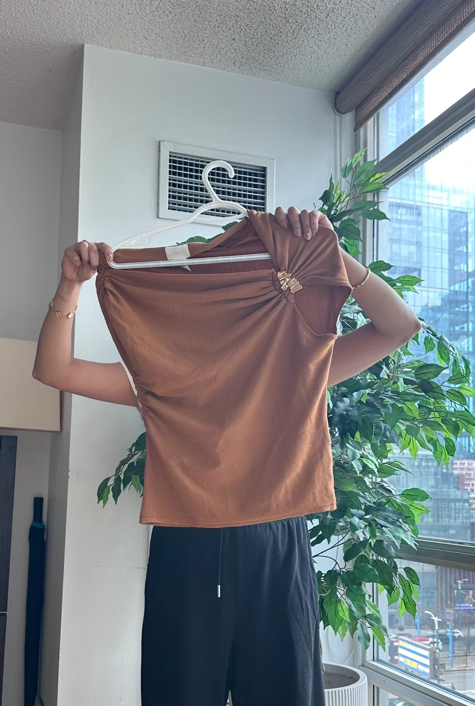This is a stylish brown halter neck top with a ruched design. It features a unique gold accent detail on the shoulder. It's made from a soft, stretchy fabric.