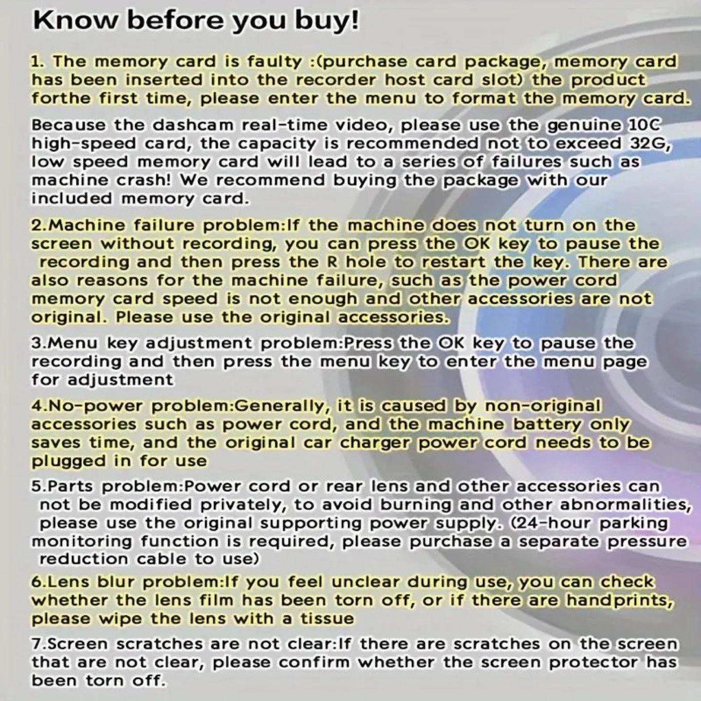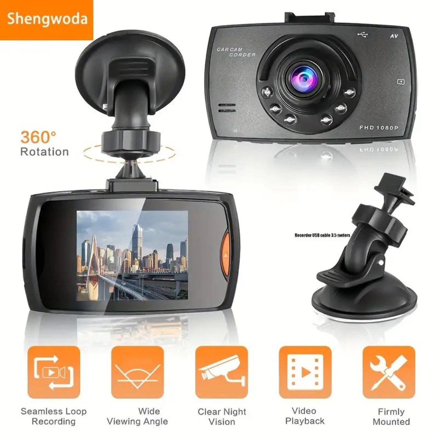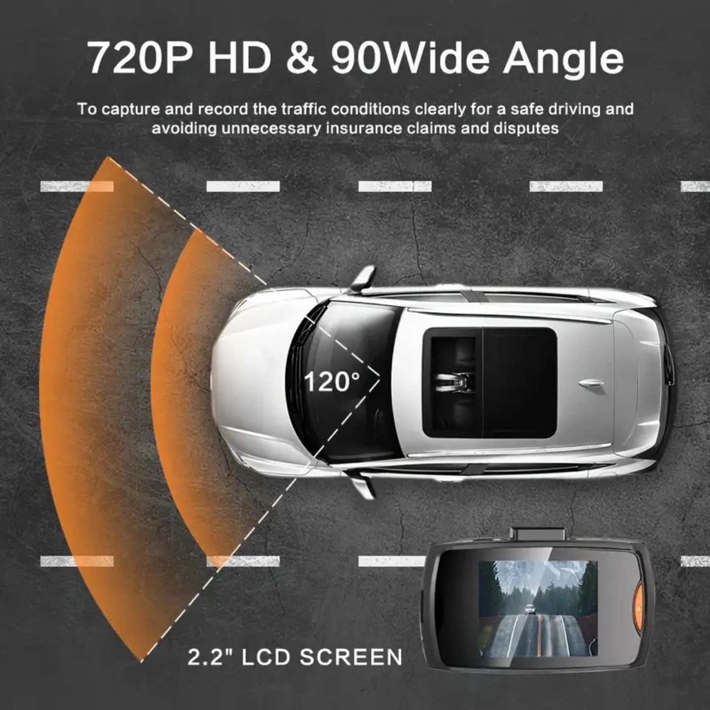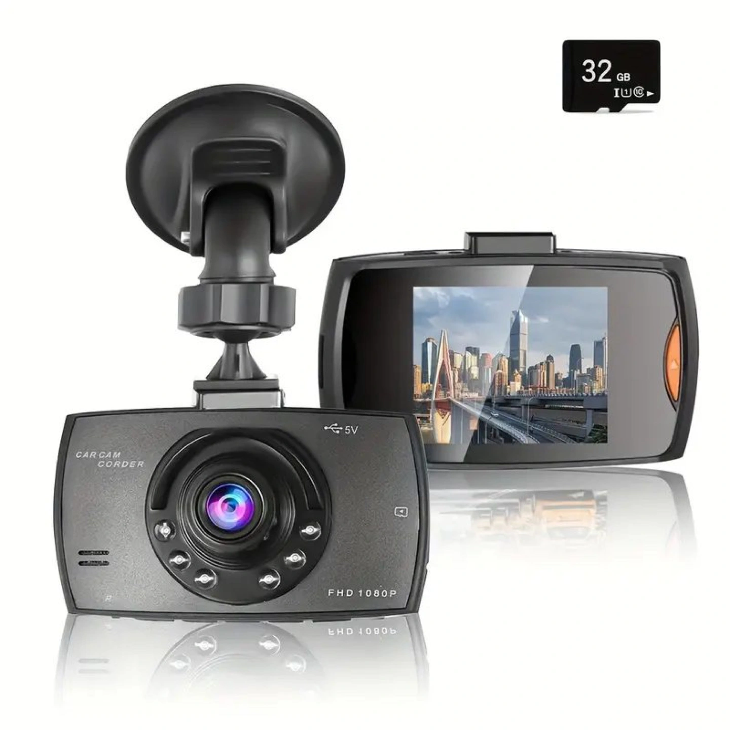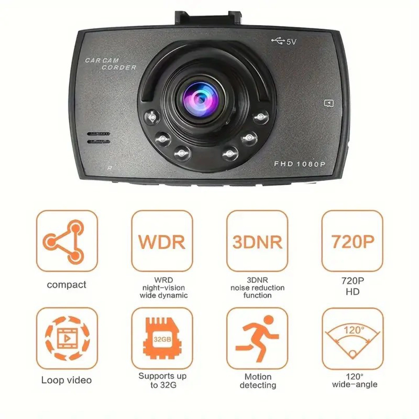 47Compact dashcam. Records in 1080p. Features night vision, motion detection, and loop recording. Includes suction cup mount. 360° rotation. Supports up to 32GB card (not included). 2.2" LCD screen. 120° wide-angle lens.
