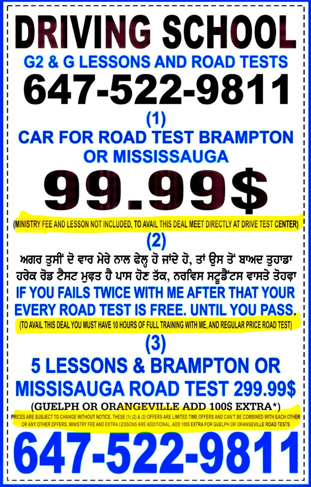 0Offering driving school lessons for G2 and G road tests in Brampton and Mississauga. MTO CERTIFIED INSTRUCTOR. Special deals available, including car for road test for $99.99, and packages with lessons. Contact 647-522-9811 for more details. If this ad is up, the service is available! Payment: Cash accepted