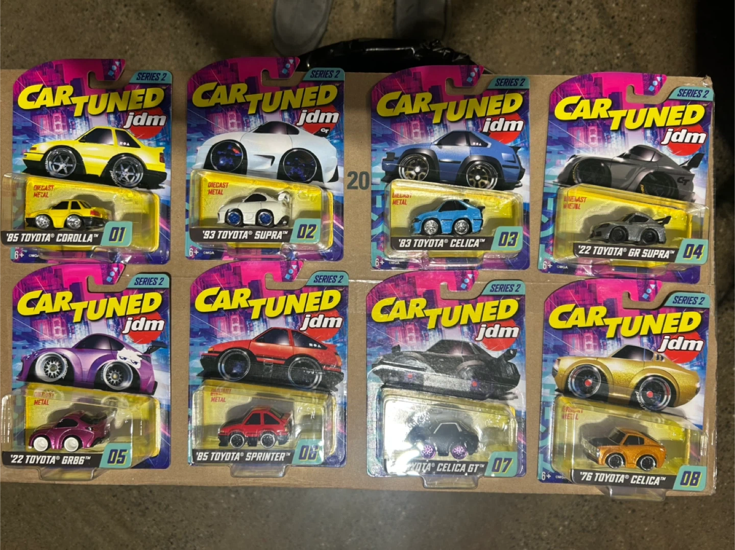 10Selling a collection of Car Tuned JDM Series 2 diecast metal cars! Each car is brand new and still in its original packaging. These are great for collectors or anyone who loves JDM cars. Available models include: - '85 Toyota Corona - '93 Toyota Supra - '83 Toyota Celica - '22 Toyota GR Supra - '22 Toyota GR86 - '85 Toyota Sprinter - '76 Toyota Celica Get your hands on these awesome diecast cars today!