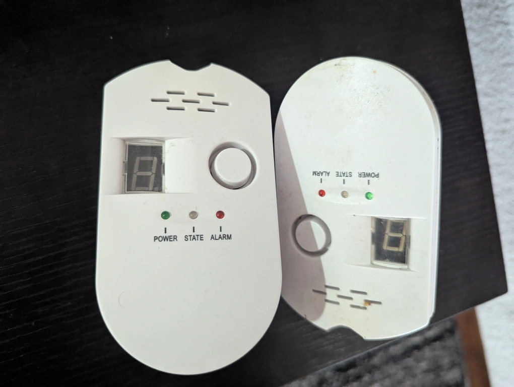 Selling two carbon monoxide detectors. They both have a digital display and indicator lights for power, state, and alarm. One of them is a bit dirty, but both are functional. 3 for $45