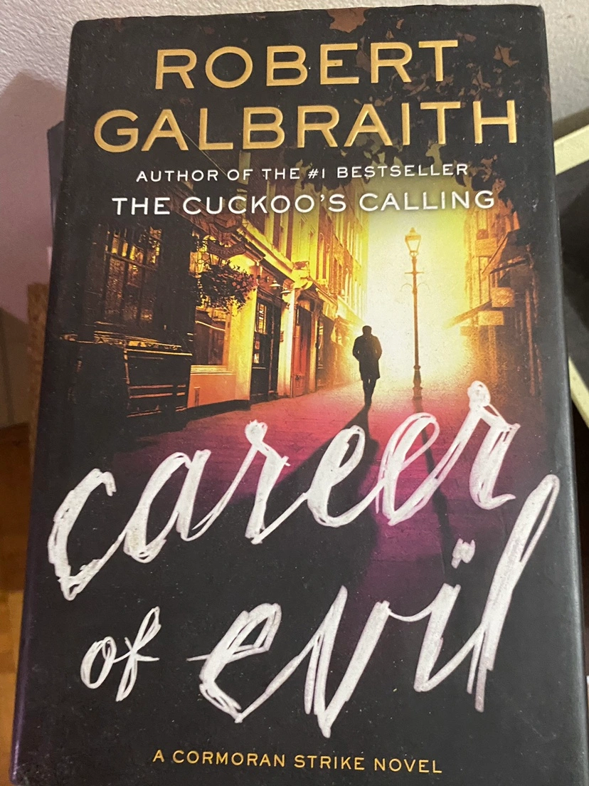 60A paperback book in the Cormoran Strike series by Robert Galbraith, titled "Career of Evil".