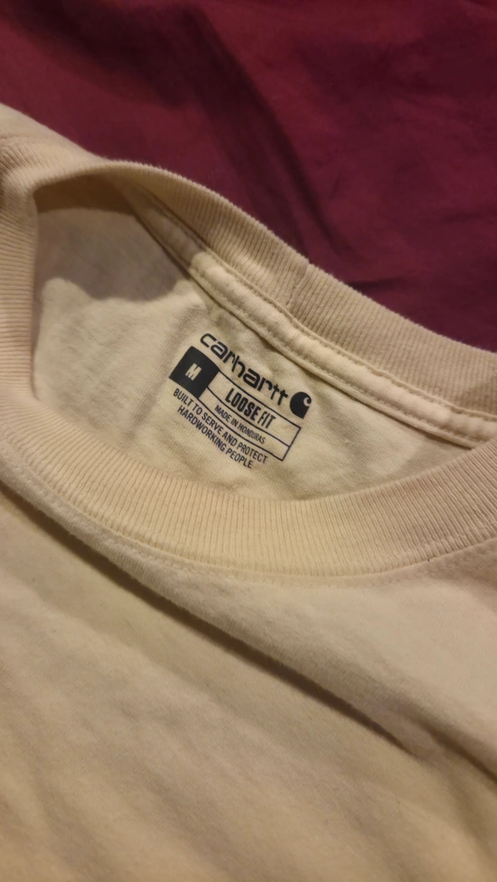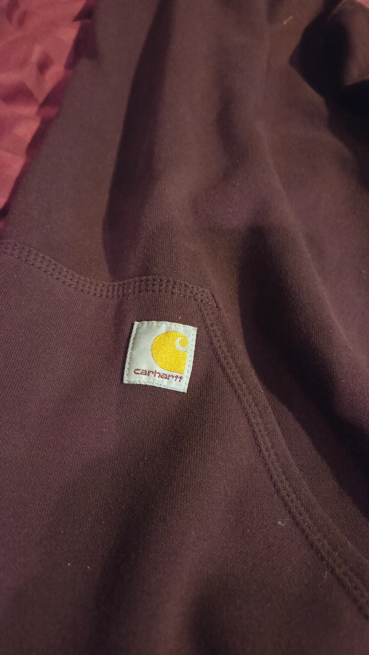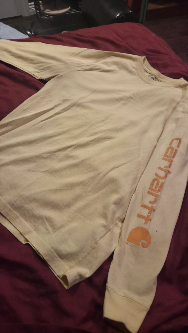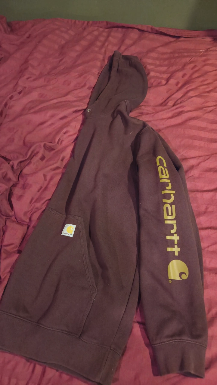 114Carhartt hoodie and a long sleeve shirt! Both are size large. Too big for me. The hoodie is maroon or dark red and the long sleeve shirt is yellow. Both have the Carhartt logo down the sleeve. 2 for $40 or 1 for $25.