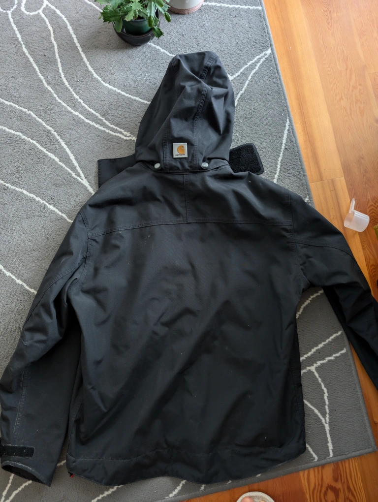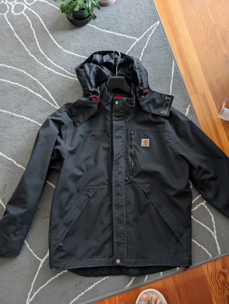 50Men's black Carhartt jacket storm defender. Features a hood and zipper closure, size Medium, Shows some minor wear.