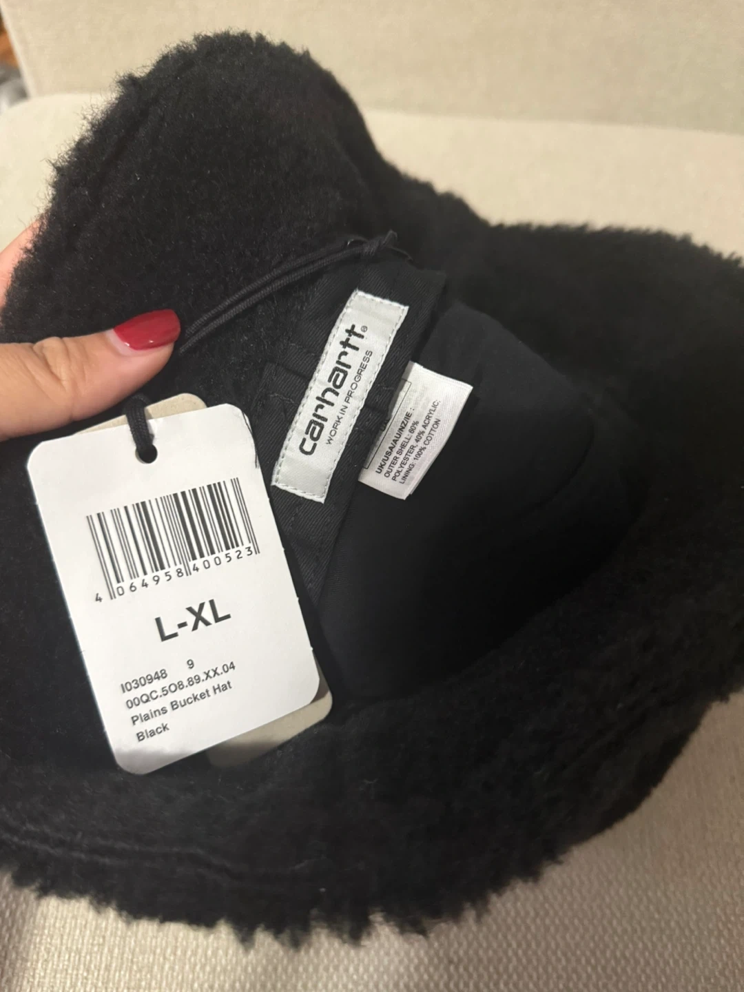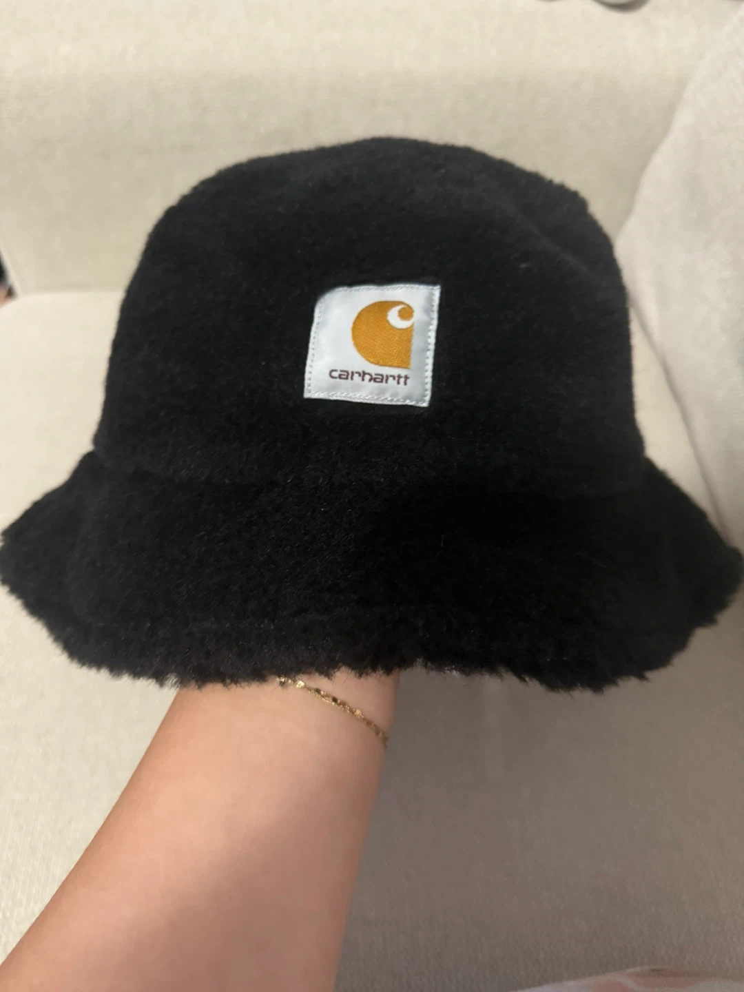 Selling a cozy Carhartt Plains Bucket Hat! It's a size L/XL and comes in black. The hat is made of 66% polyester, 24% acrylic, and 10% cotton. Perfect for keeping your head warm and stylish!