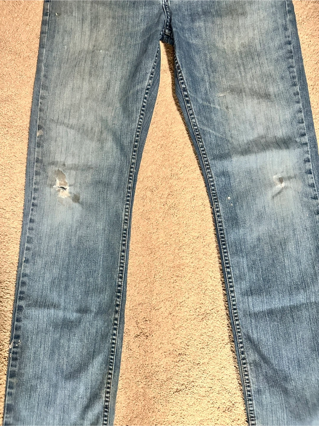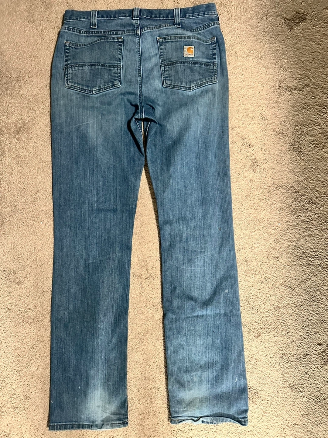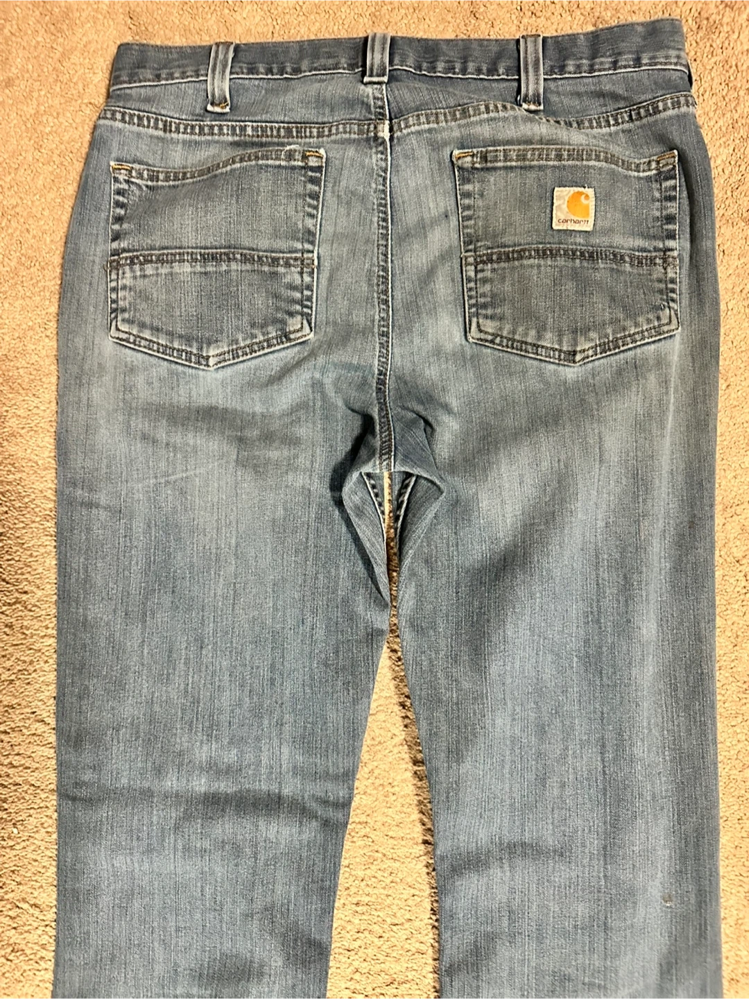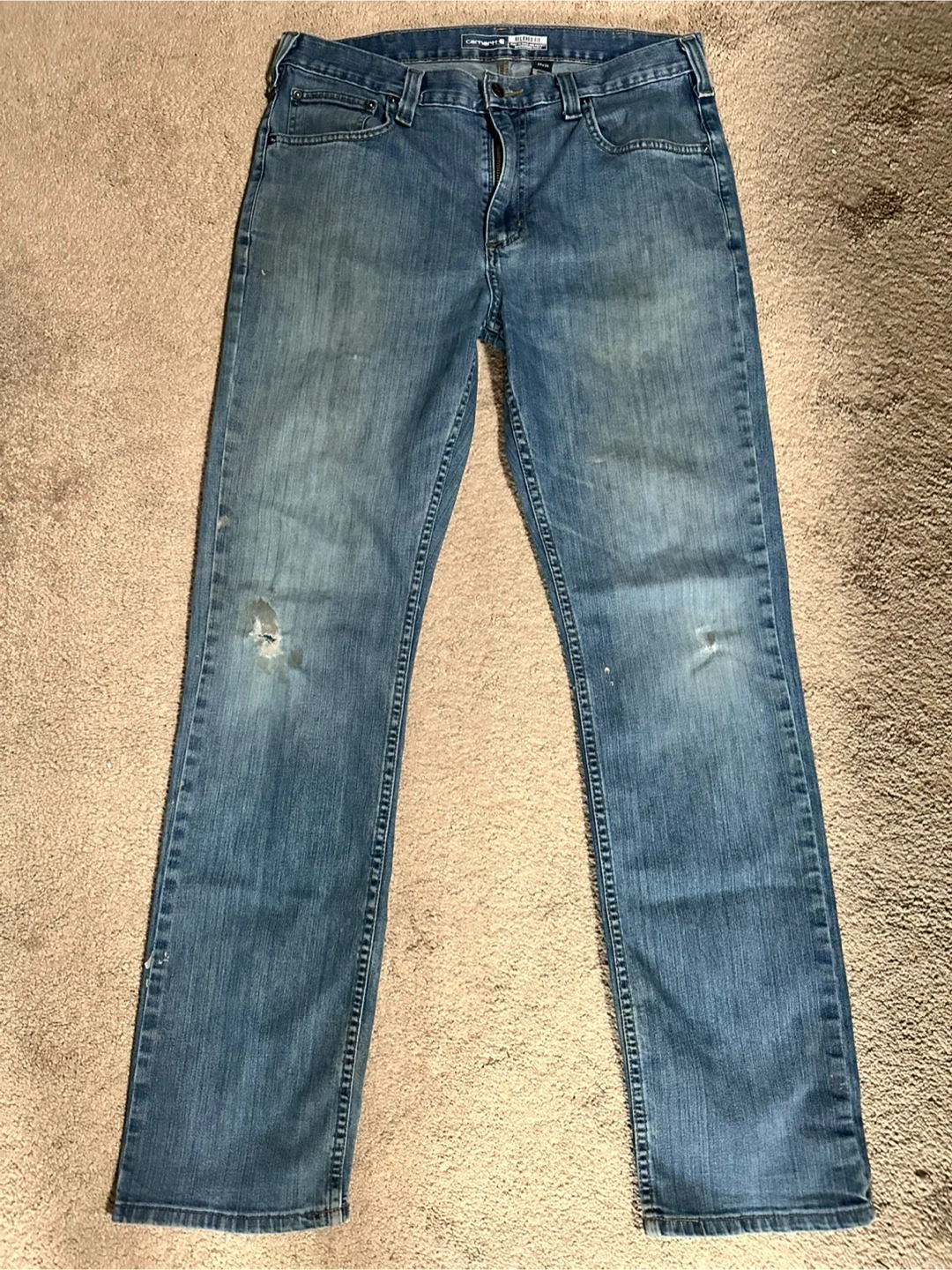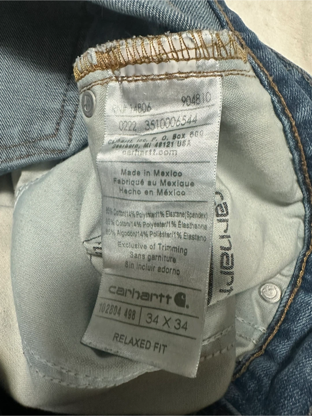 10Selling a pair of Carhartt jeans in size 34x34 with a relaxed fit. They're made from a blend of 85% cotton, 14% polyester, and 1% elastane. Please note there are some signs of wear.