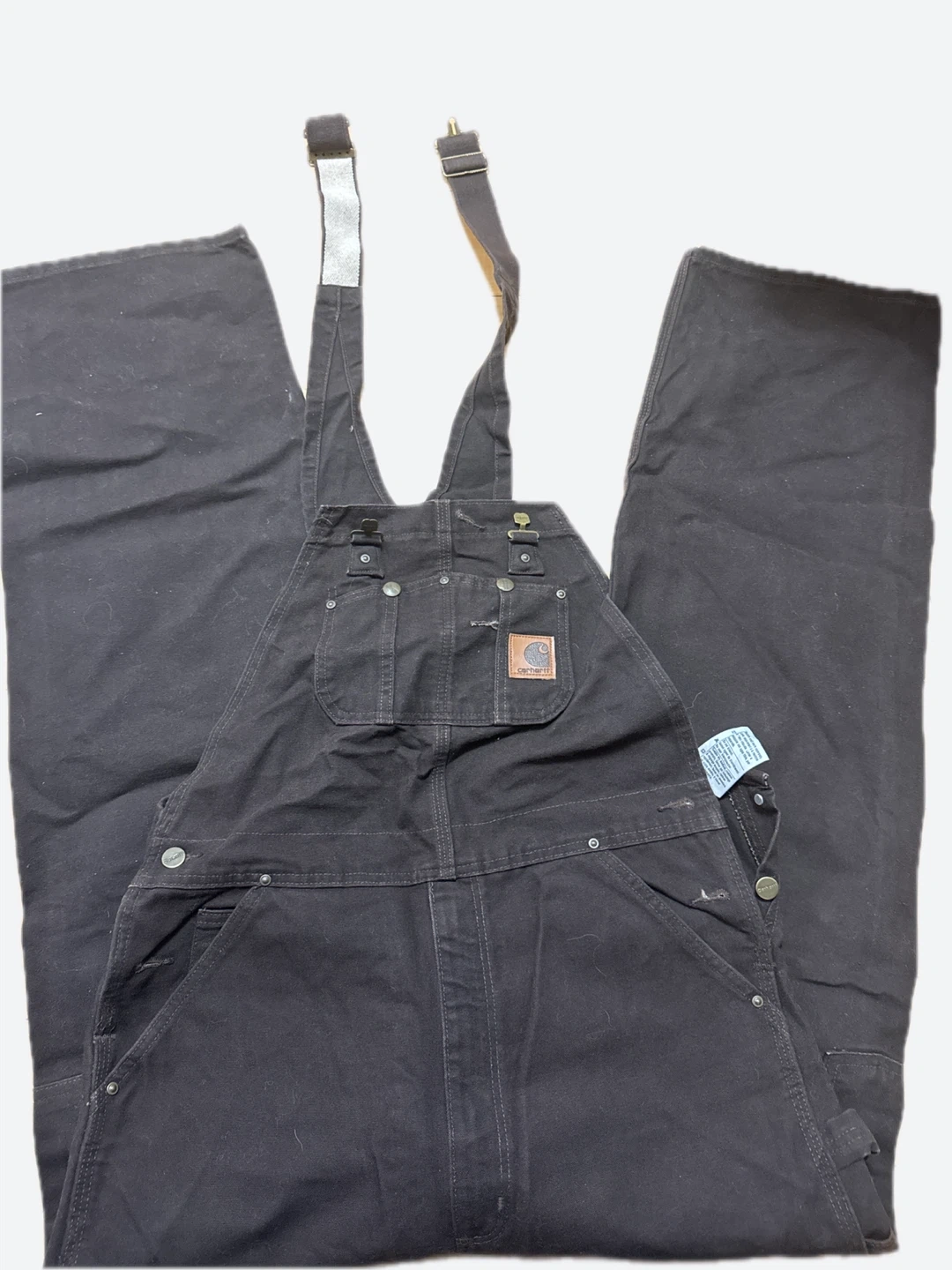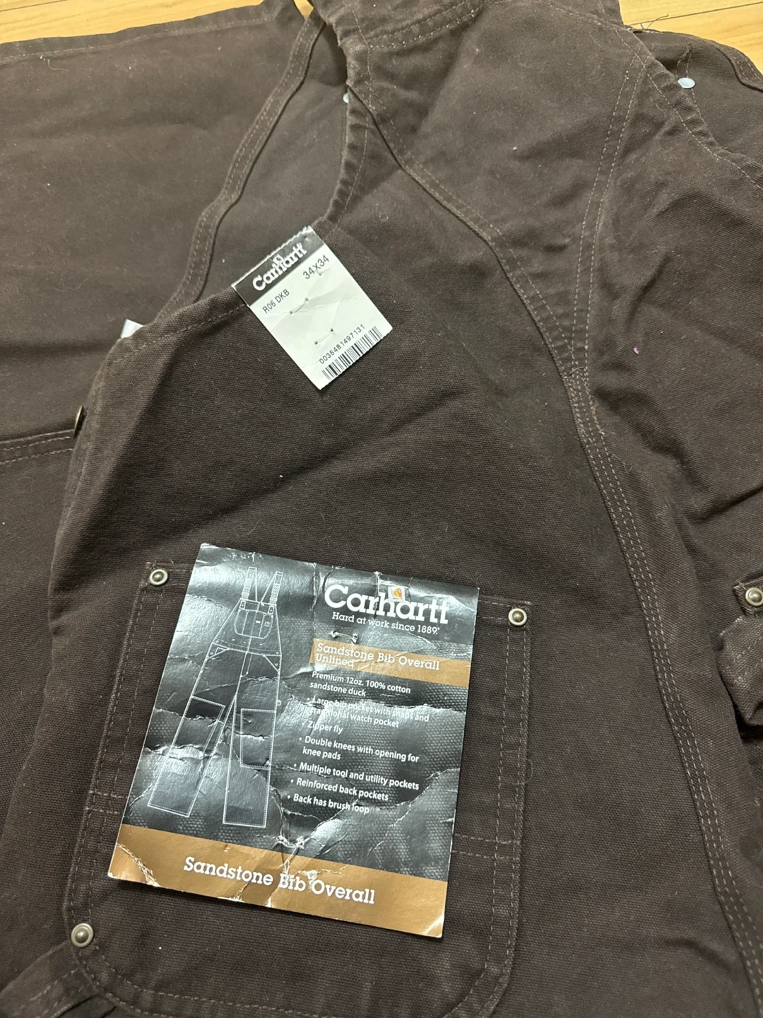 Selling a pair of Carhartt Sandstone Bib Overalls in size 34x34. These overalls are made of 100% cotton sandstone duck and feature multiple tool and utility pockets, reinforced back pockets, and double knees with openings for knee pads. These are perfect for work or casual wear!