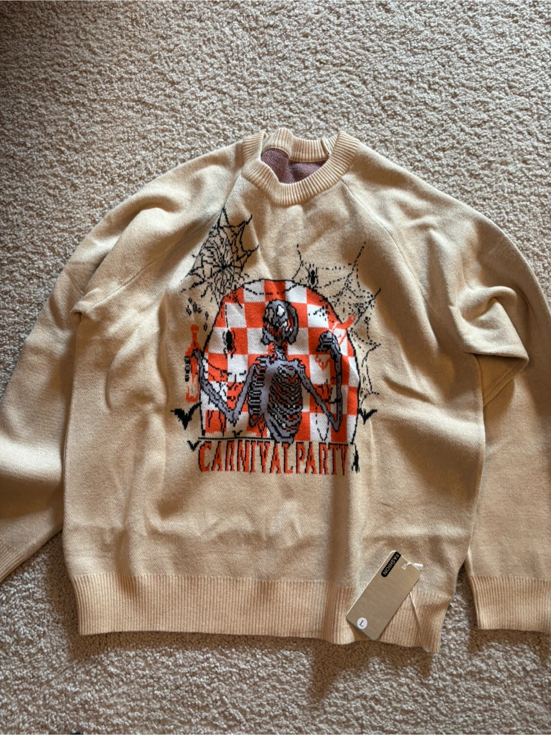 33Cozy Carnival Party sweater featuring a skeleton design! It's in great condition and a size large. Perfect for adding a bit of fun to your wardrobe!