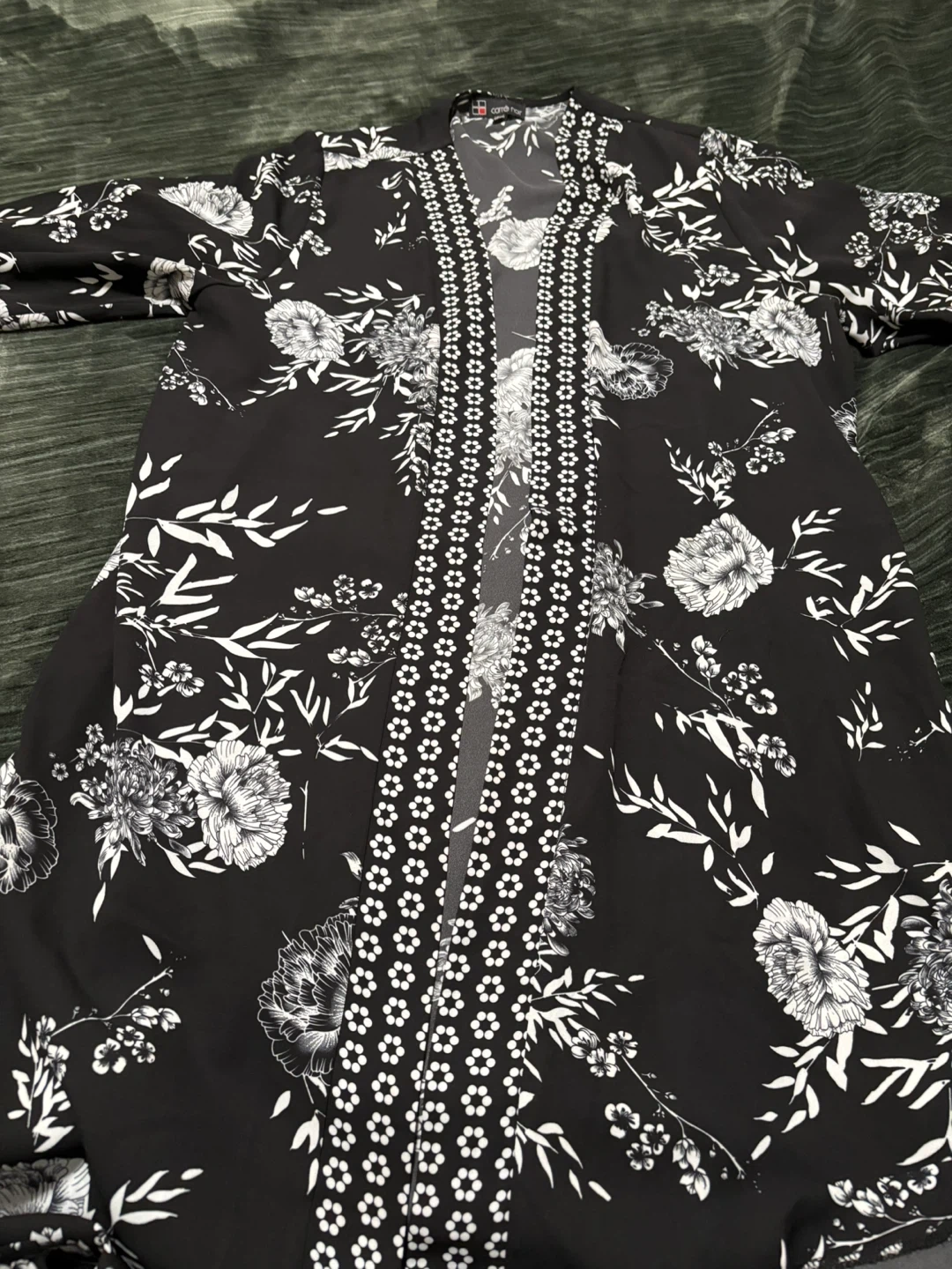 43Selling a Carré Noir kimono with a beautiful floral design! It's a size M/M and features a stylish black and white pattern. Perfect for adding a touch of elegance to any outfit.