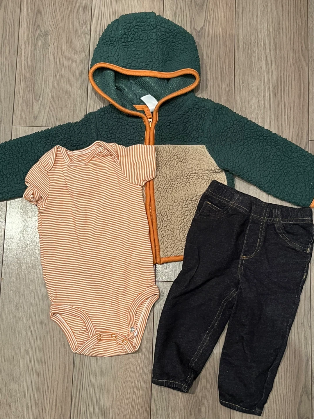 31Selling a cute Carter's outfit set in size 12 months! The set includes a cozy green sherpa jacket with orange trim, a striped orange and white onesie, and dark wash denim pants. Perfect for keeping your little one comfy and stylish! Pick up at Brow of the Hill near 10th and Royal, New Westminster. Check out my other listings!