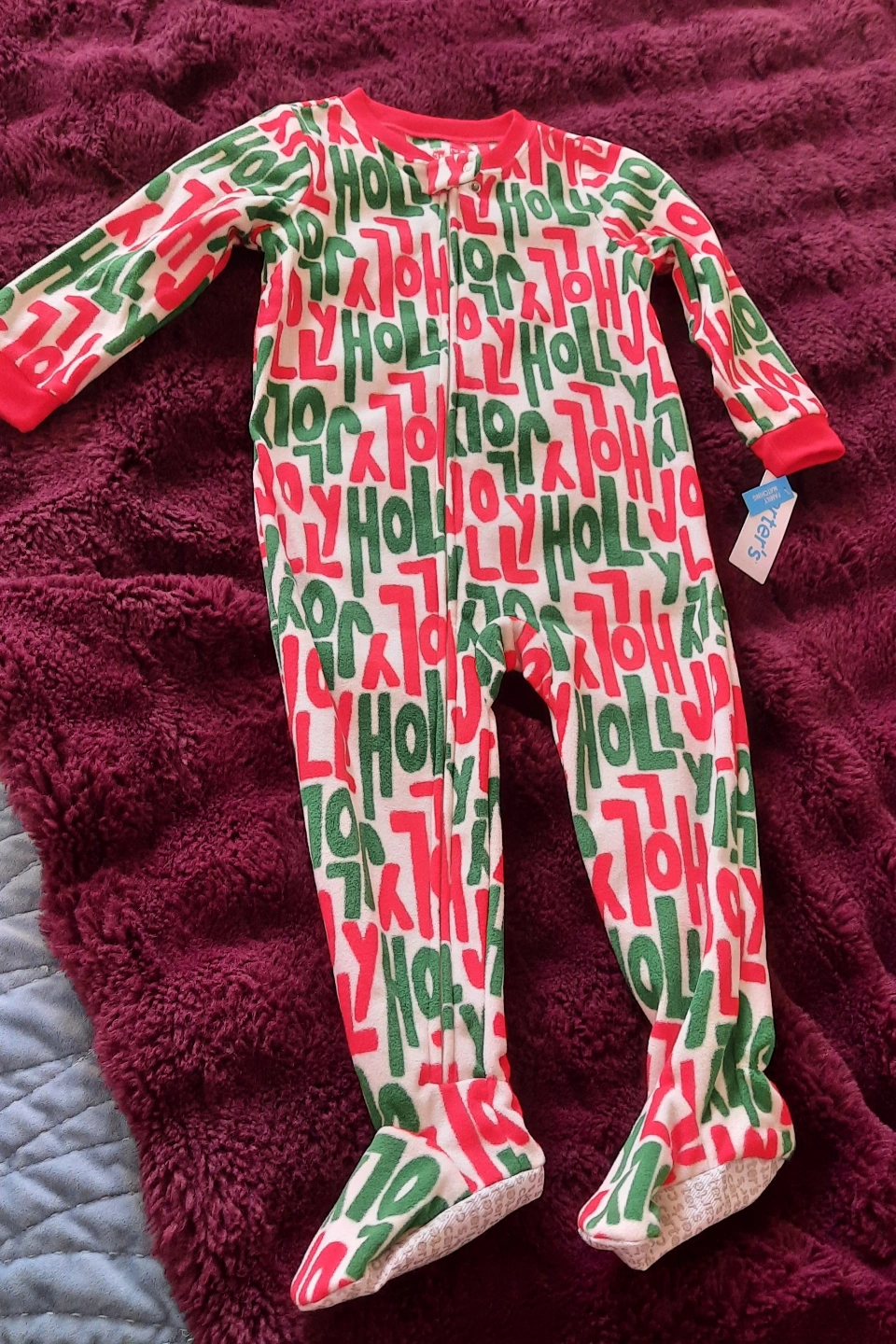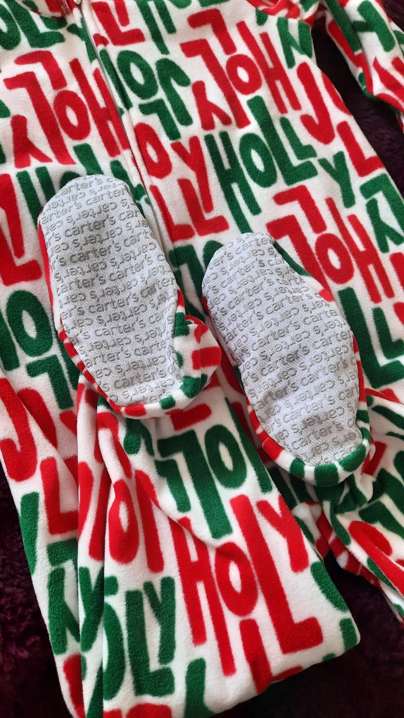Adorable Carter's holiday-themed sleepers. Size 3T. Fleece material. Features a festive Holly Jolly print in red and green. Zip closure. New with tags.