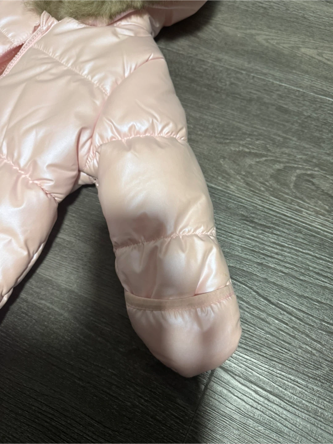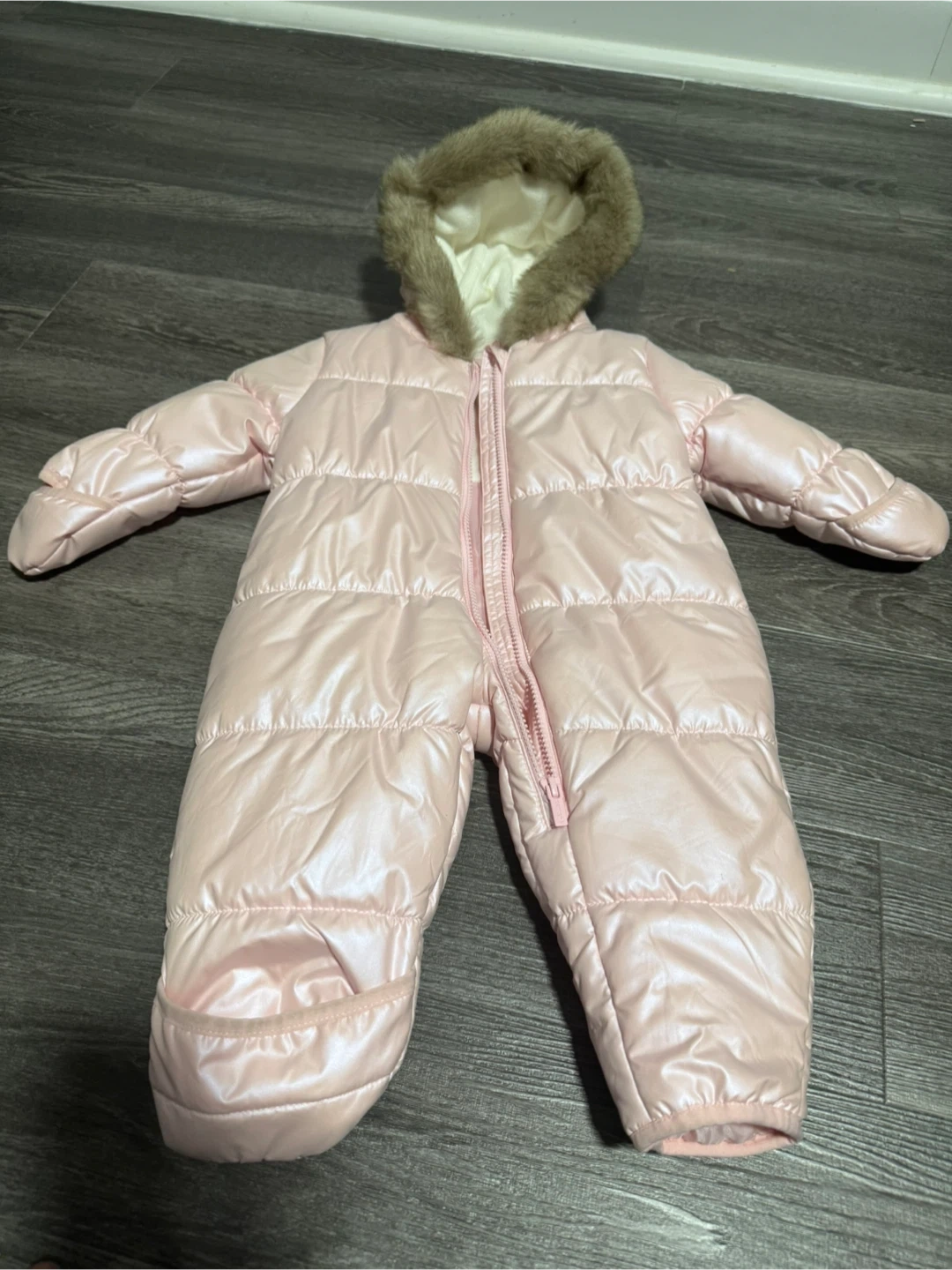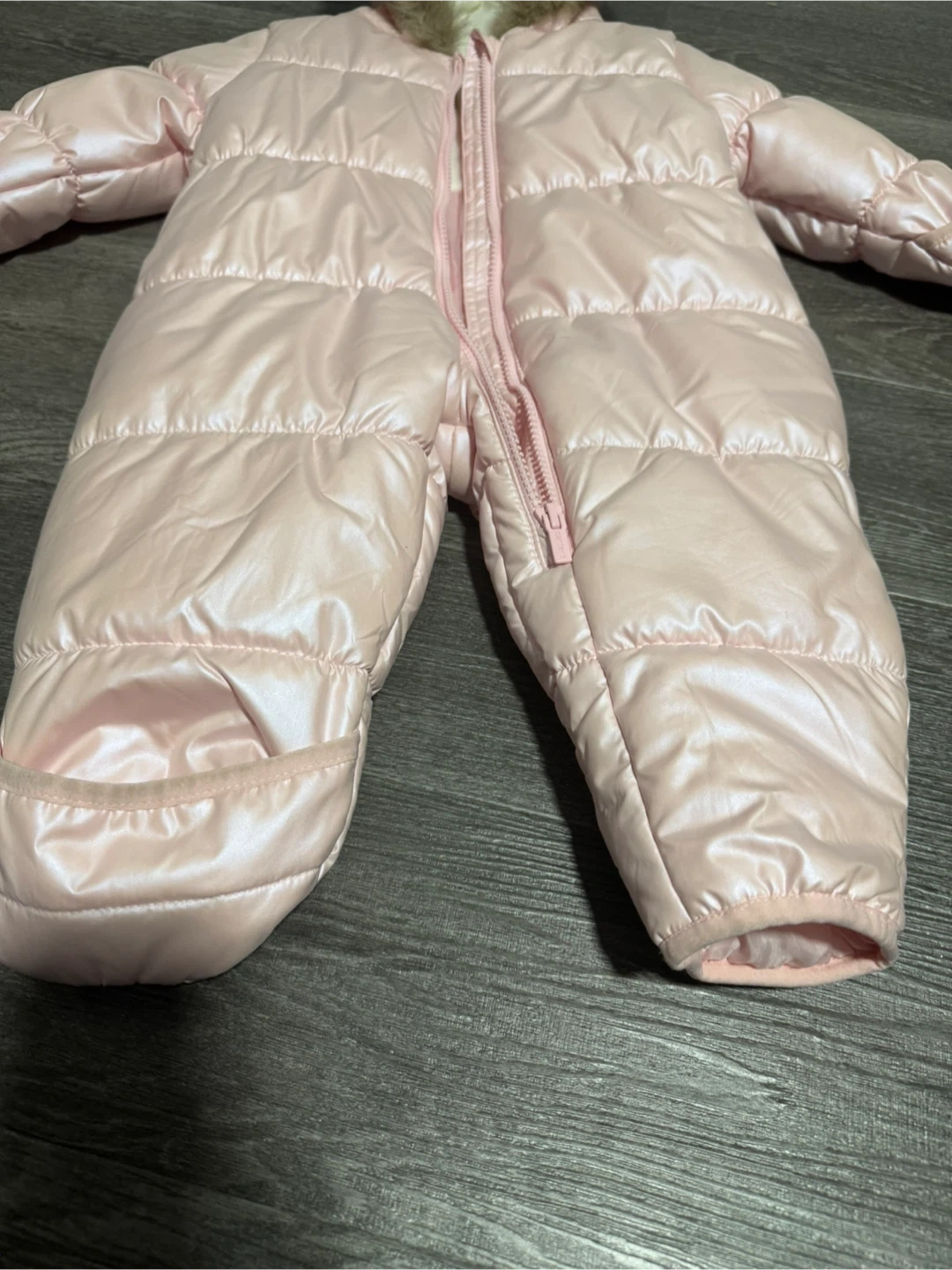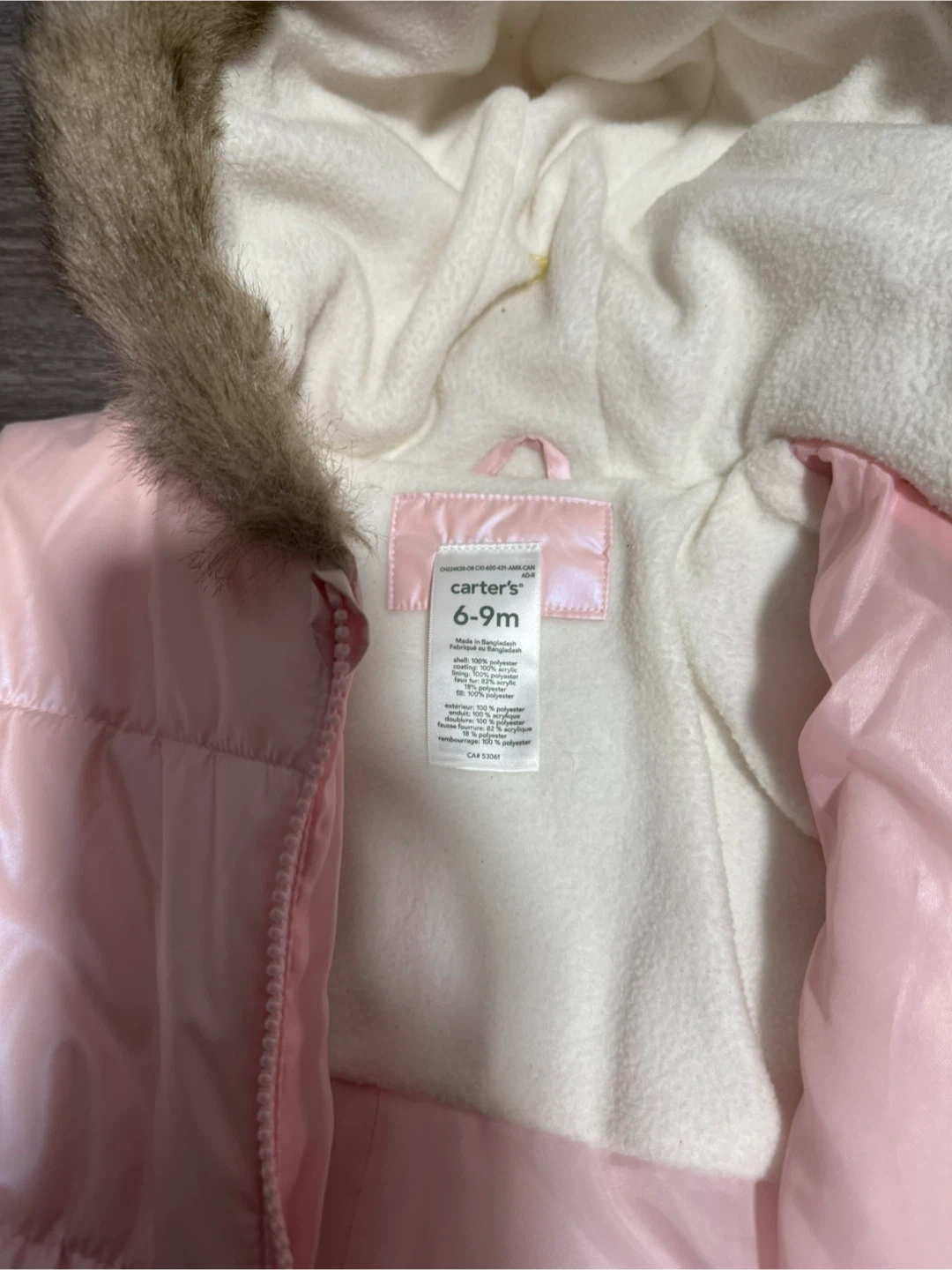 A cute and cozy Carter's snowsuit for your little one! This pink snowsuit is perfect for keeping your baby warm during the colder months. Waterproof material on the outer side. It's in great condition and sized for 6-9 months. Keep your littlest cozy and covered all winter long in this 1-piece snowsuit. Complete with a double-front zip closure for easy on-and-off over baby's winter outfits, removable mittens and booties for easy access to hands and feet, and a faux fur-trimmed hood adds extra warmth from head to toe. Features: Front-zip diagonal closure Fold-over hands and feet Inner soft closure Faux-fur trim on hood Fleece lining Fabric & Care: 100% poly Imported Machine washable Used just a couple of times. Originally bought for $57cad