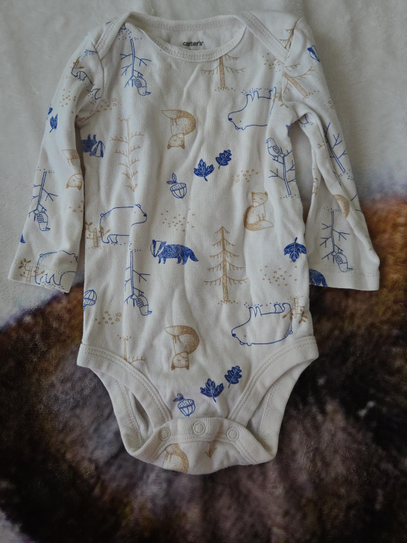 A cute Carter's baby onesie with a woodland print! Features foxes, bears, trees, and acorns in blue and brown on a white background. Perfect for your little one!