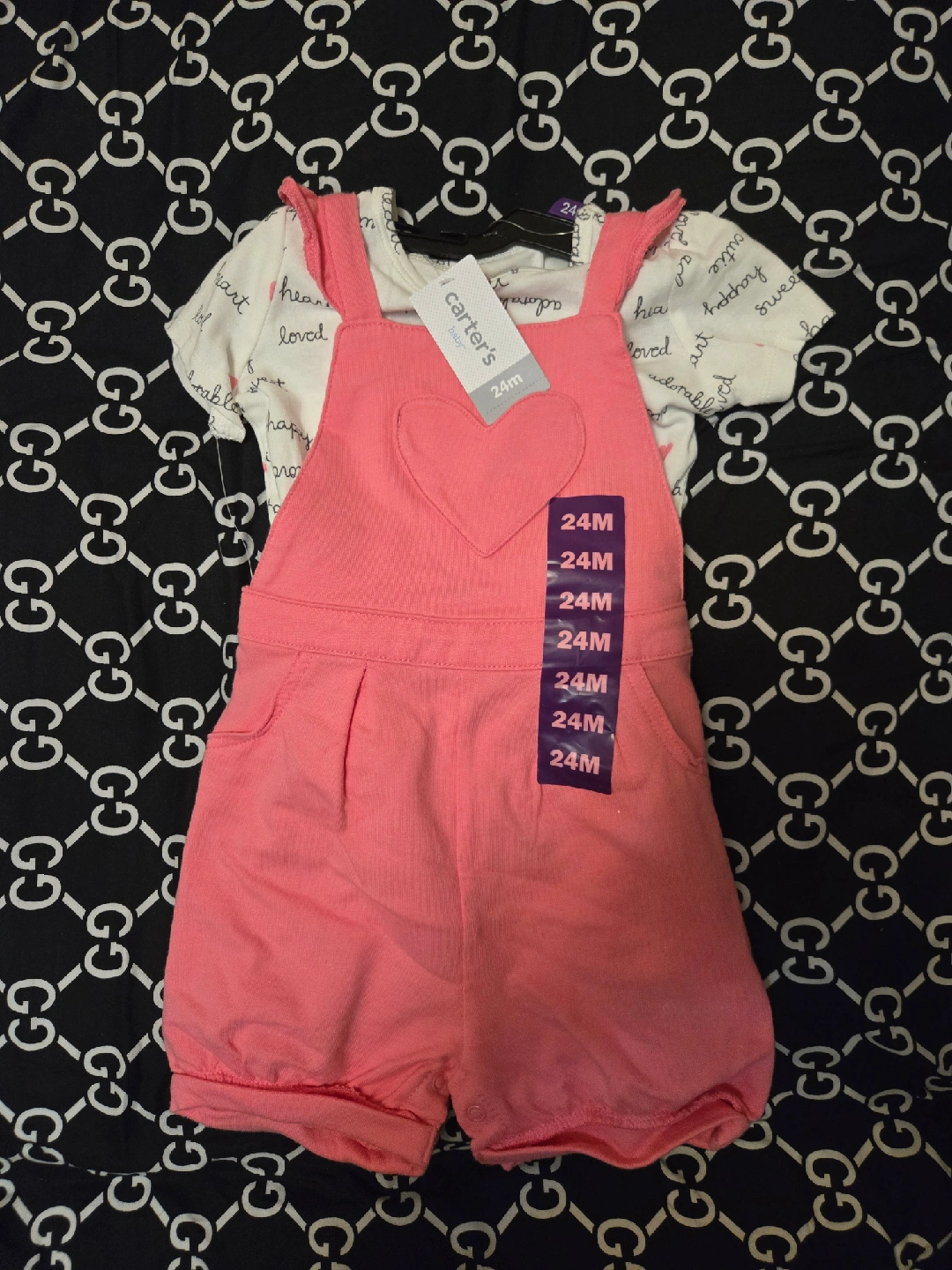 5This adorable Carter's baby outfit is perfect for your little one! It features a cute top and a pair of pink overalls with a heart detail. The size is 24 months. It's in great condition and ready for a new home!