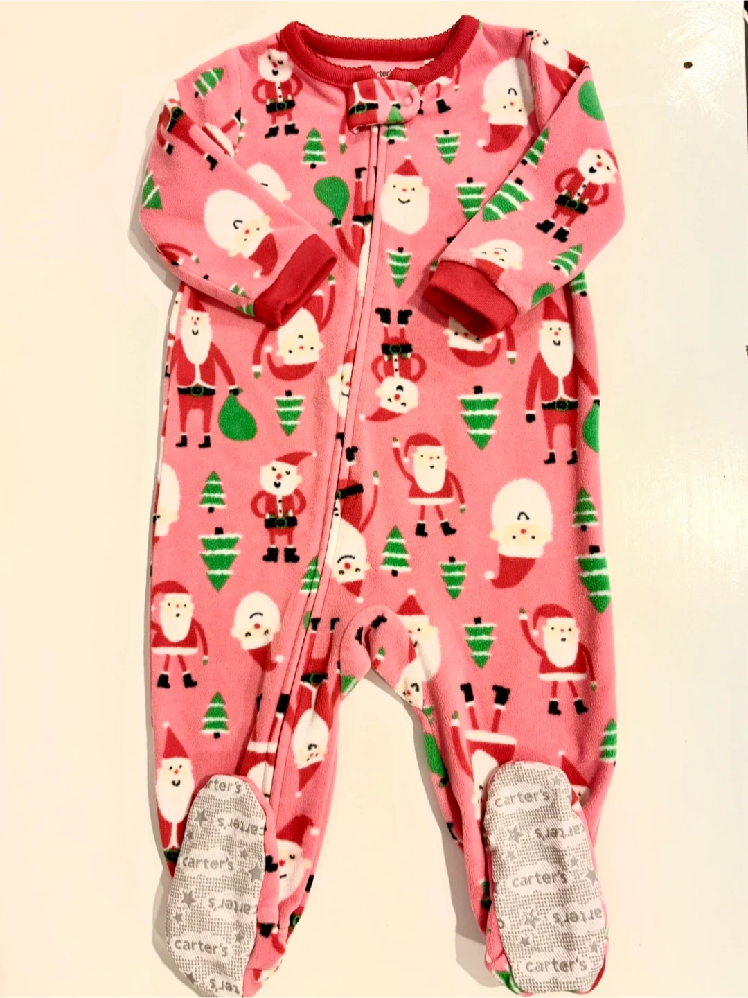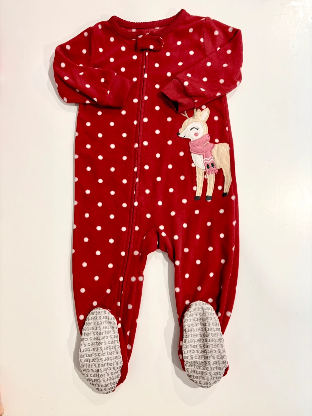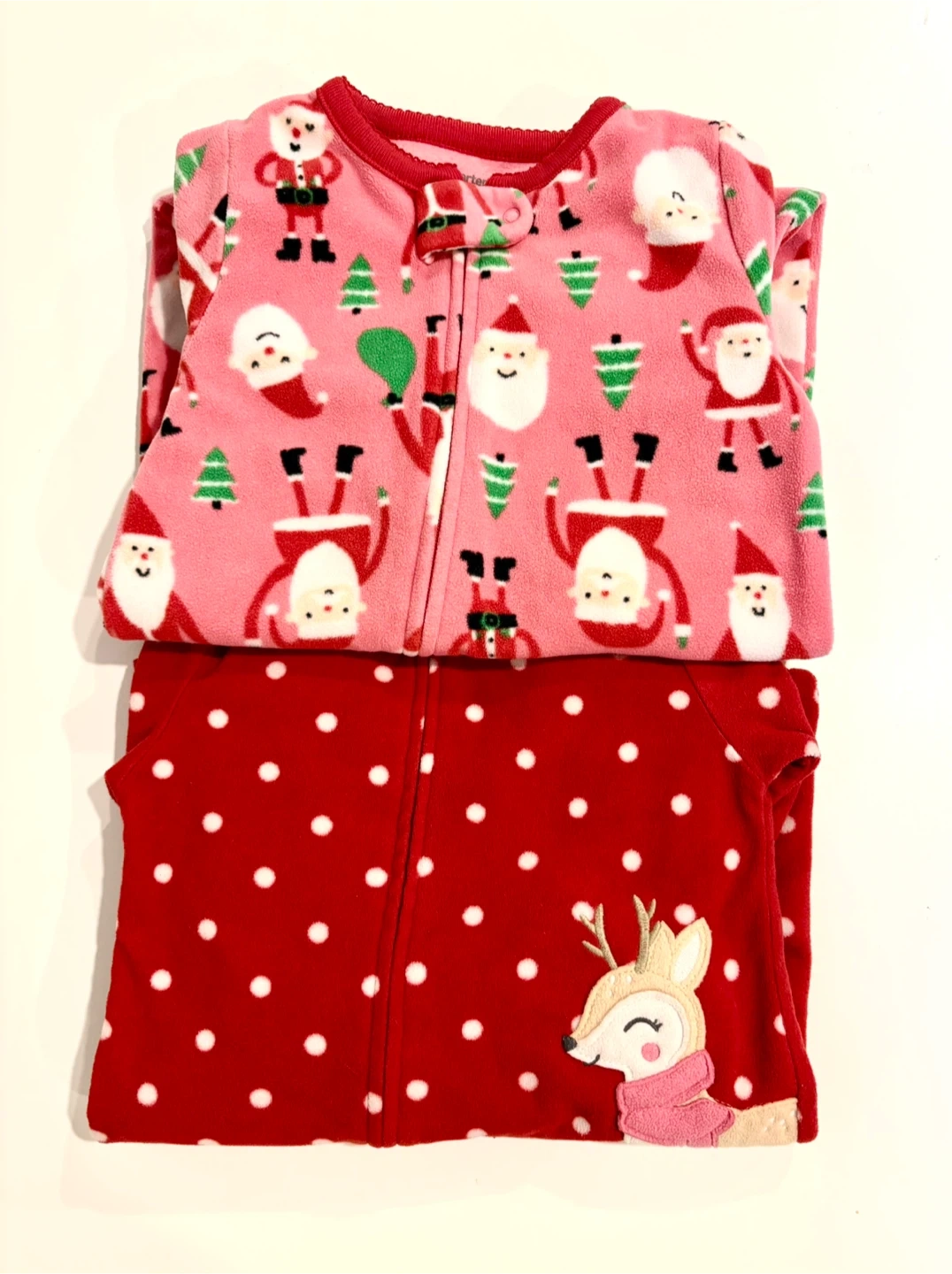 65Here are two adorable baby sleepers from Carter's! One is a red sleeper with white polka dots and a cute deer design, and the other is a pink sleeper with a Santa Claus pattern. Perfect for keeping your little one cozy and warm! Size 6-12 months $10 for both