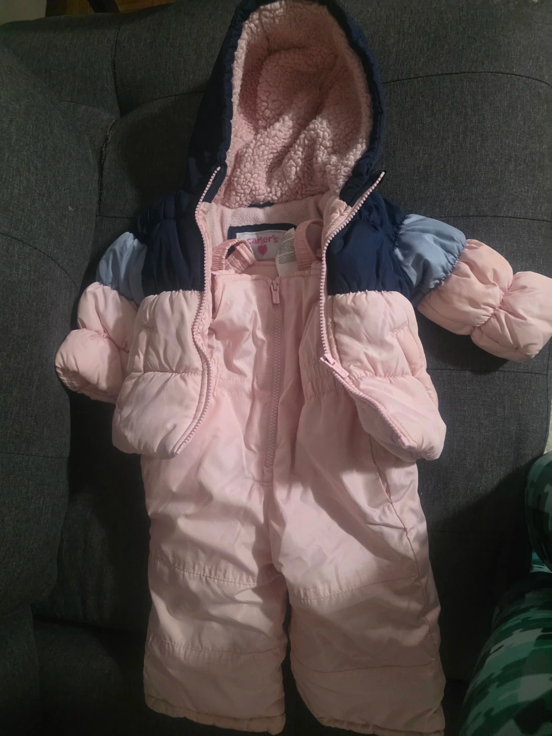 286A cute and cozy Carter's baby snowsuit, perfect for keeping your little one warm this winter! It features a pink and blue colour scheme with a soft, plush lining in the hood. Great for outdoor adventures!