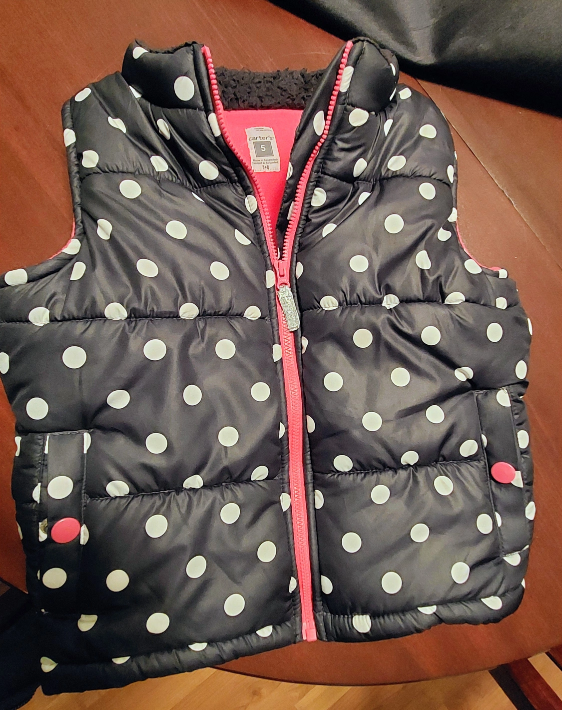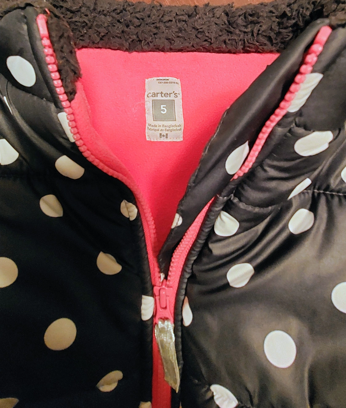 Super cute Carter's puffer vest in size 5! It's dark blue with white polka dots and has a bright pink lining and zipper. Perfect for layering on chilly days!