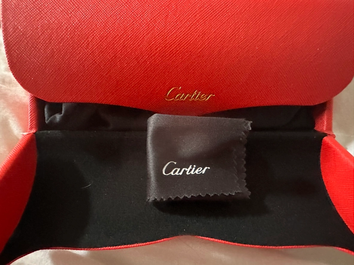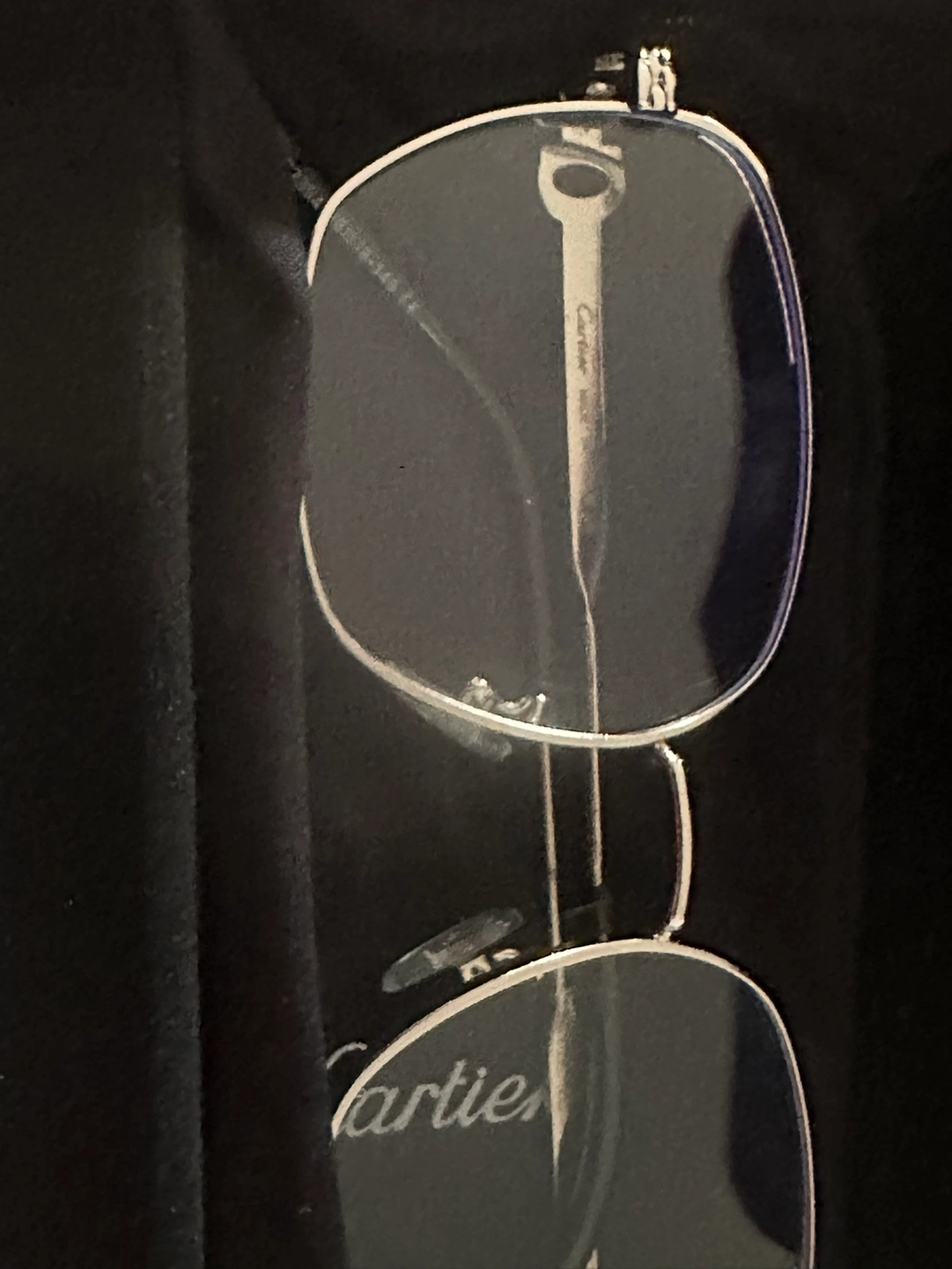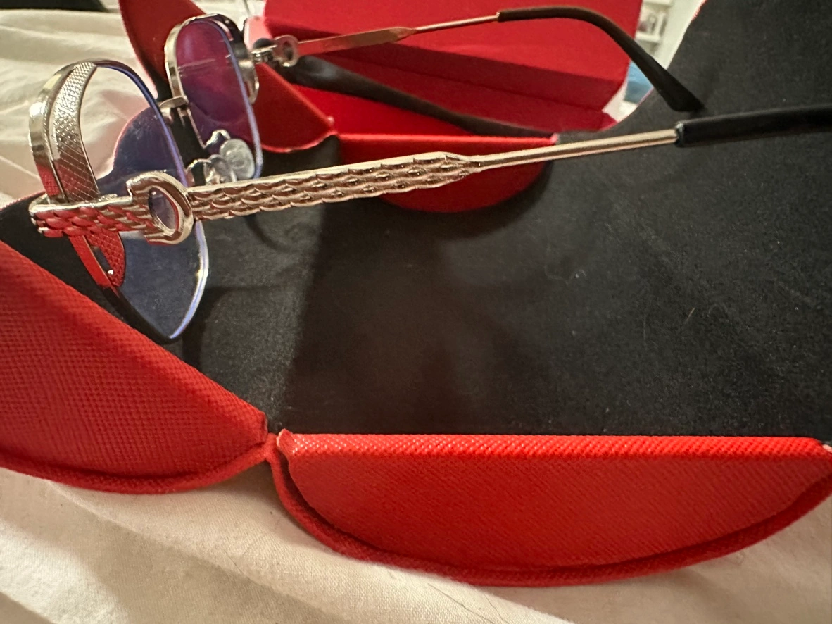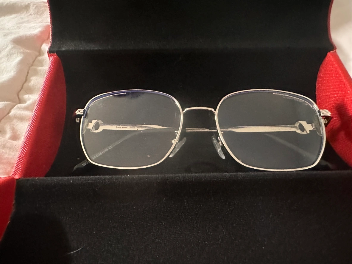 These Cartier glasses are silver (coloured) frames. They come with a box, glass case, pouch, and cleaning cloth. They aren’t authentic Cartier. You can put your prescription in them if you choose. (Cash only)