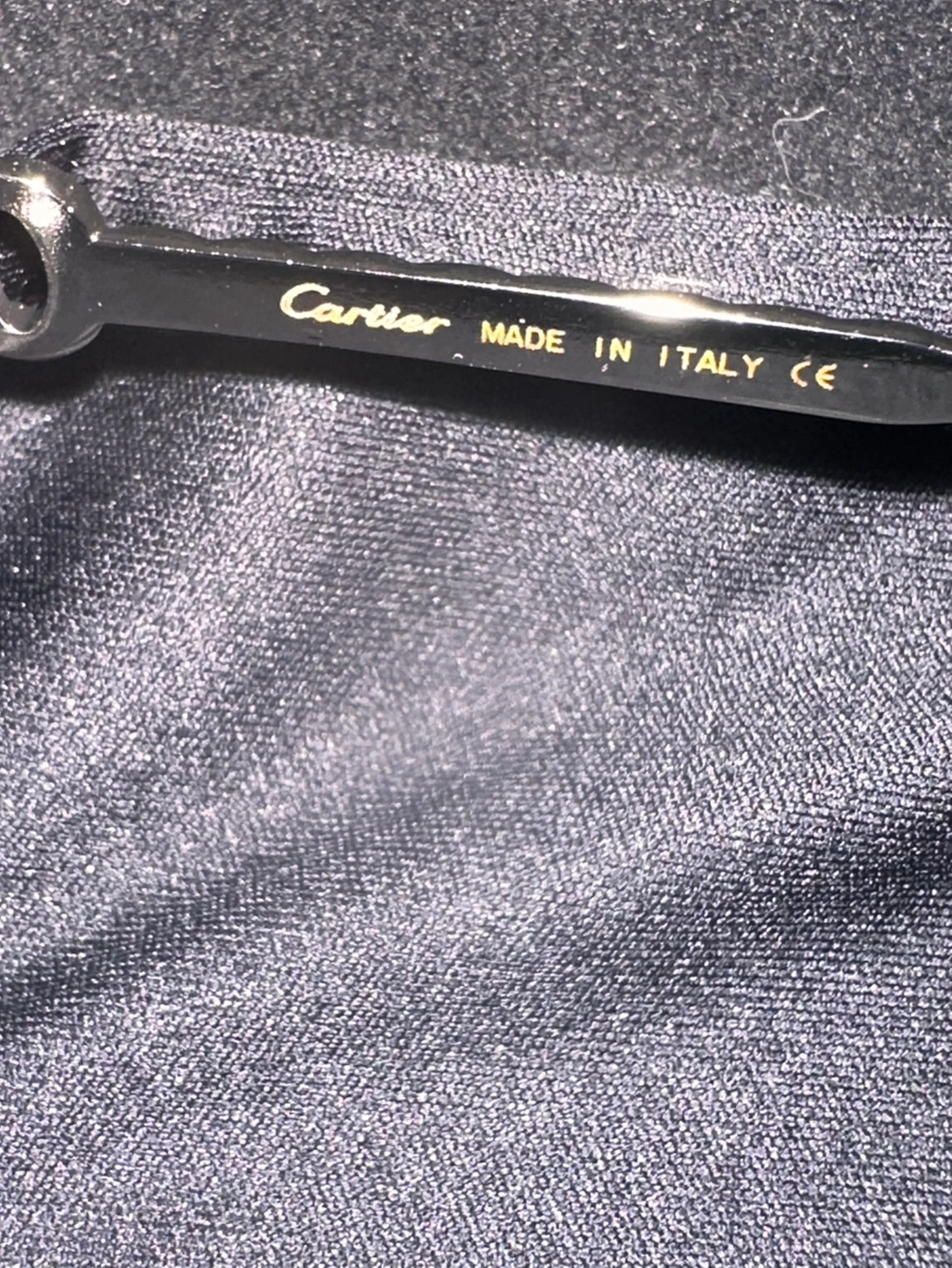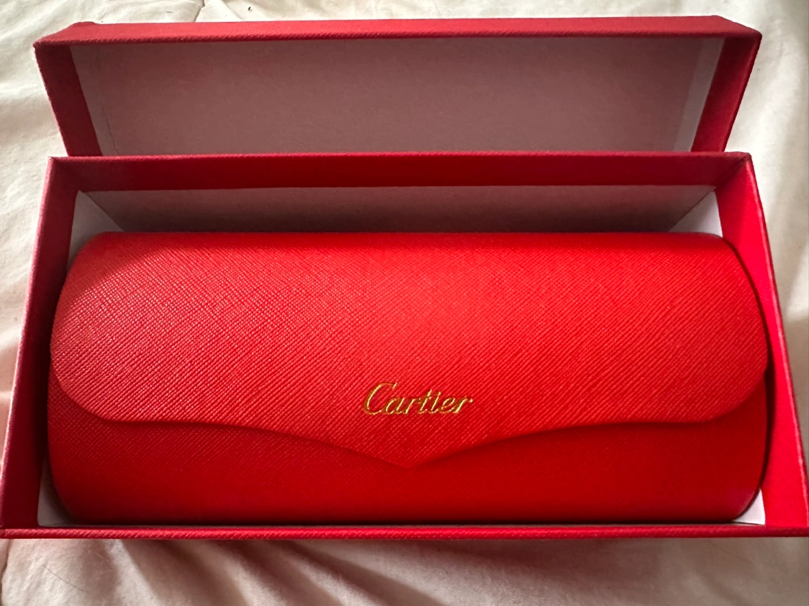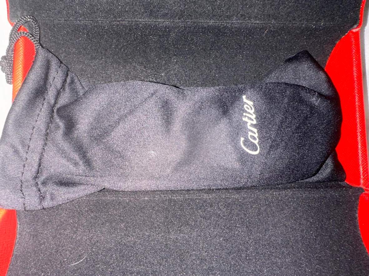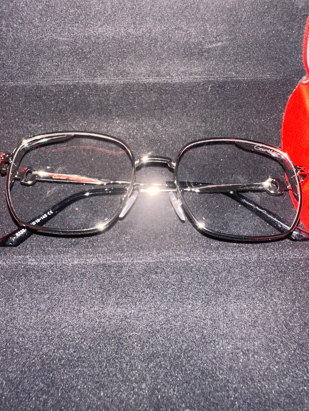 These Cartier glasses are silver (coloured) frames. They come with a box, glass case, pouch, and cleaning cloth. They aren’t authentic Cartier. You can put your prescription in them if you choose. (Cash only)