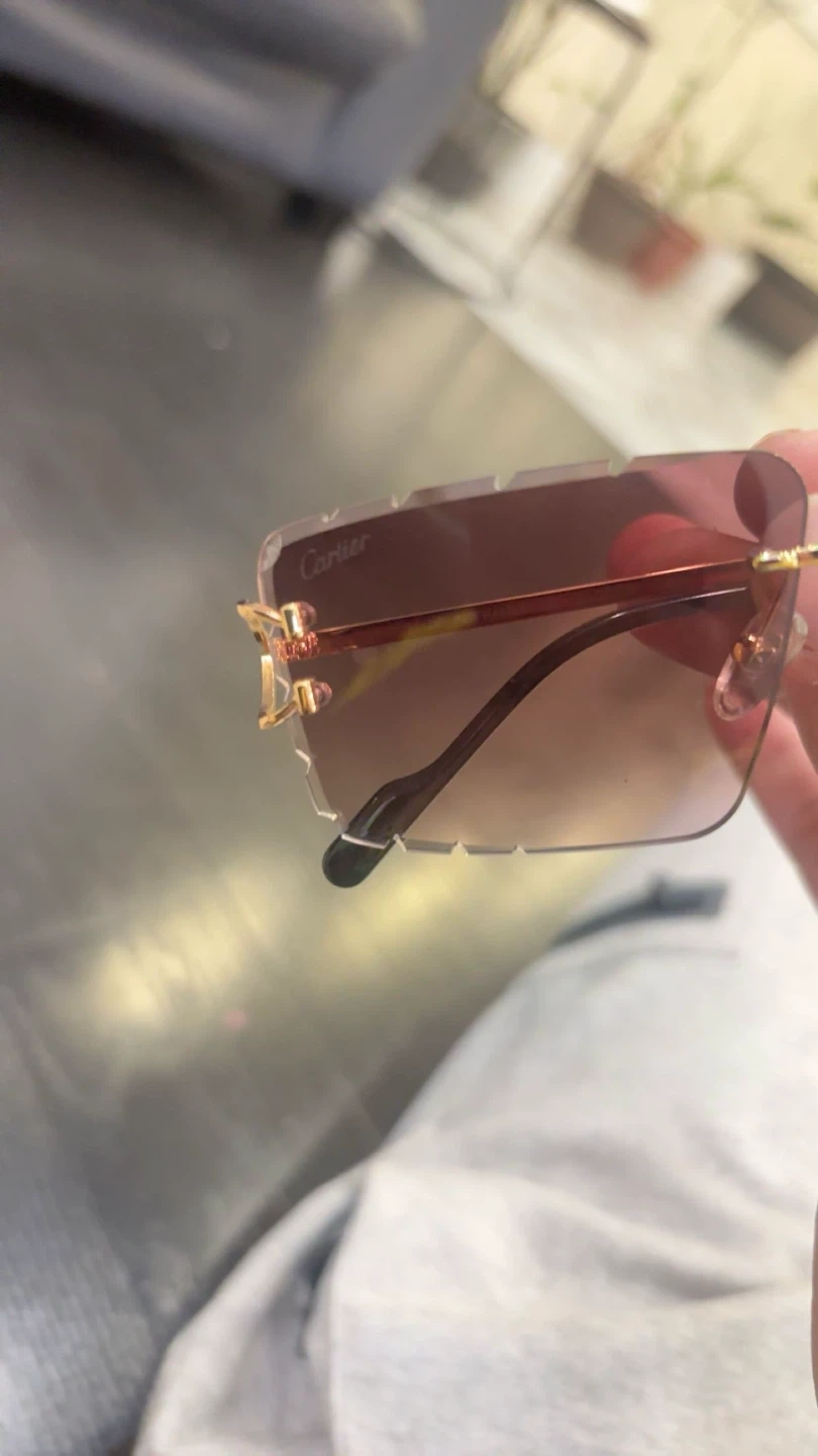 60Selling a pair of Cartier sunglasses. They feature a unique rimless design and gold accents. The lenses have a brown gradient. These sunglasses are in great condition and ready for a new owner I had box and everything