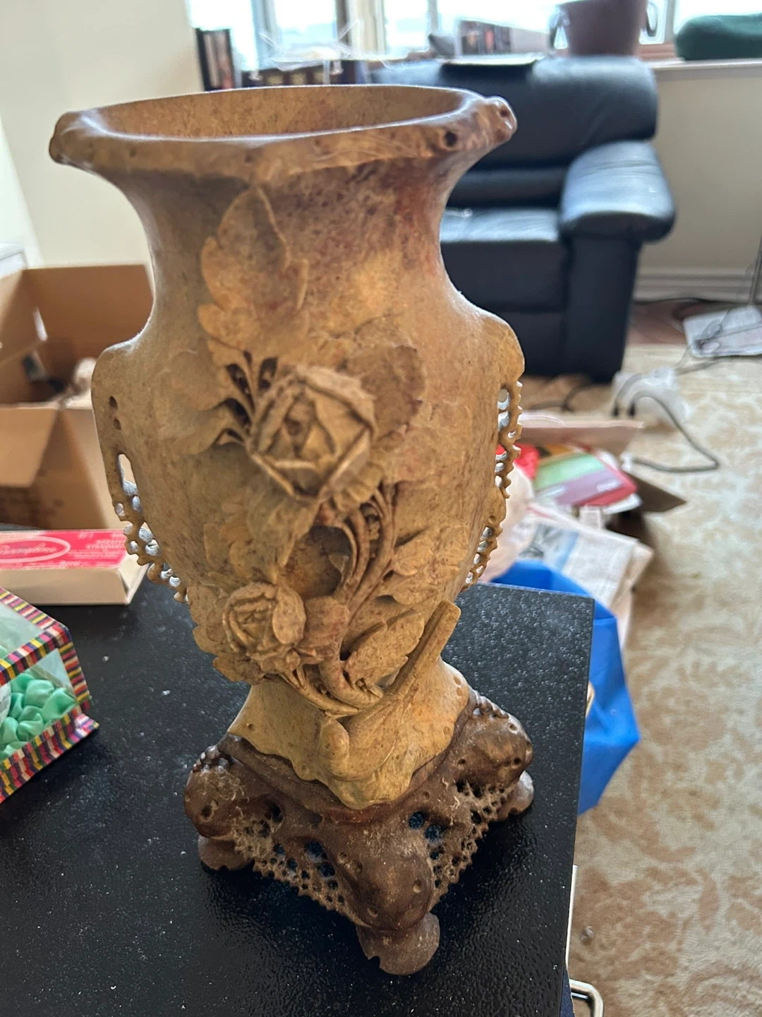5Selling a vintage stone vase with a beautiful floral carving. It has an ornate base and a unique design that would look great in any room.