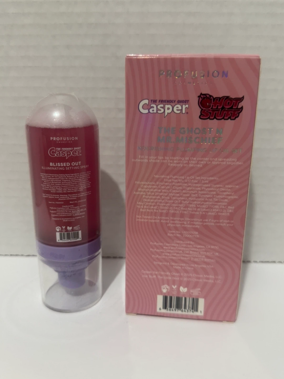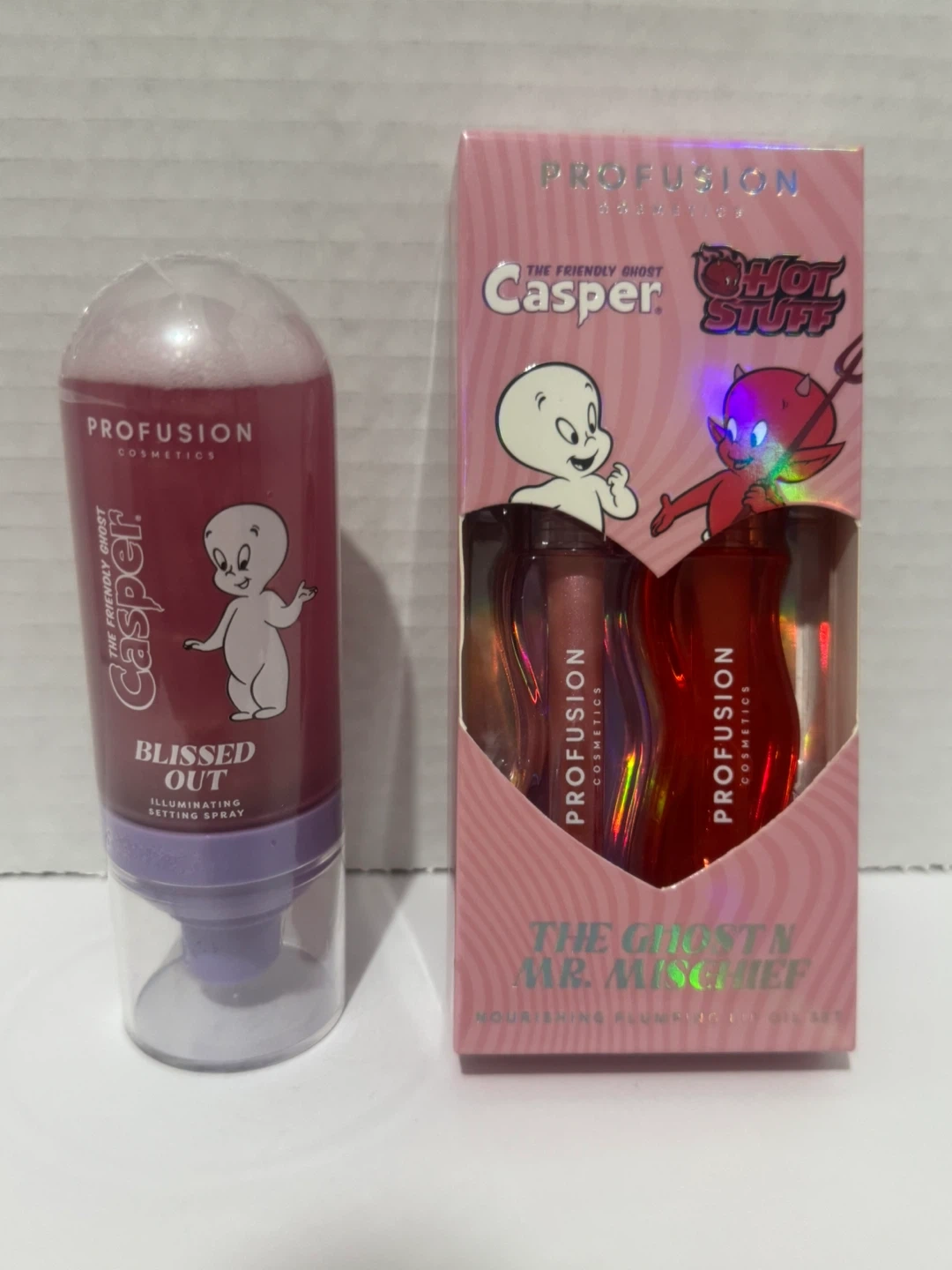 78Selling a cute Profusion Cosmetics set featuring Casper the Friendly Ghost! This includes the Blissed Out Illuminating Setting Spray and The Ghost n Mr. Mischief Nourishing Plumping Lip Oil Set. Perfect for adding a touch of fun to your makeup routine Setting spray only $8 Lip oil sold
