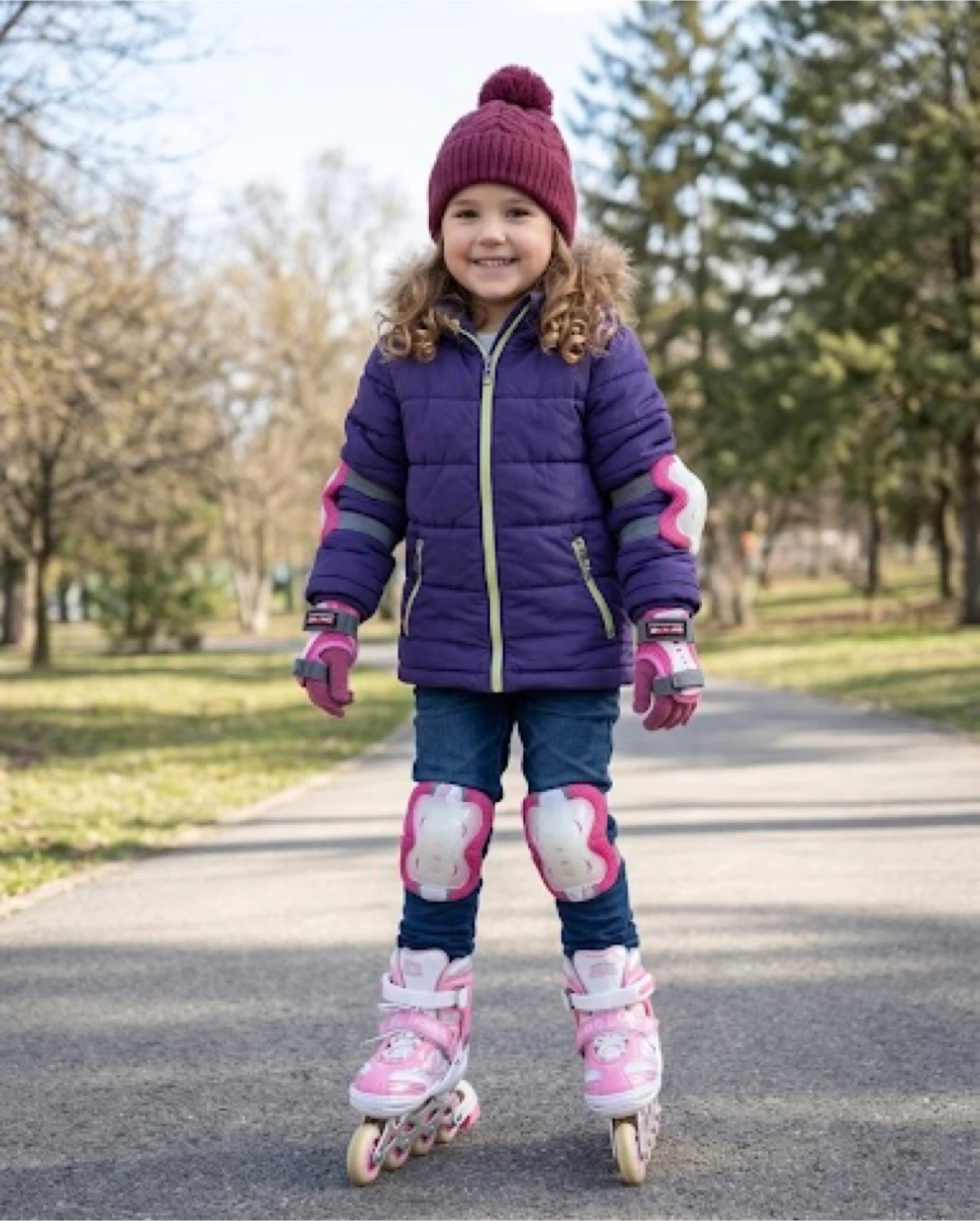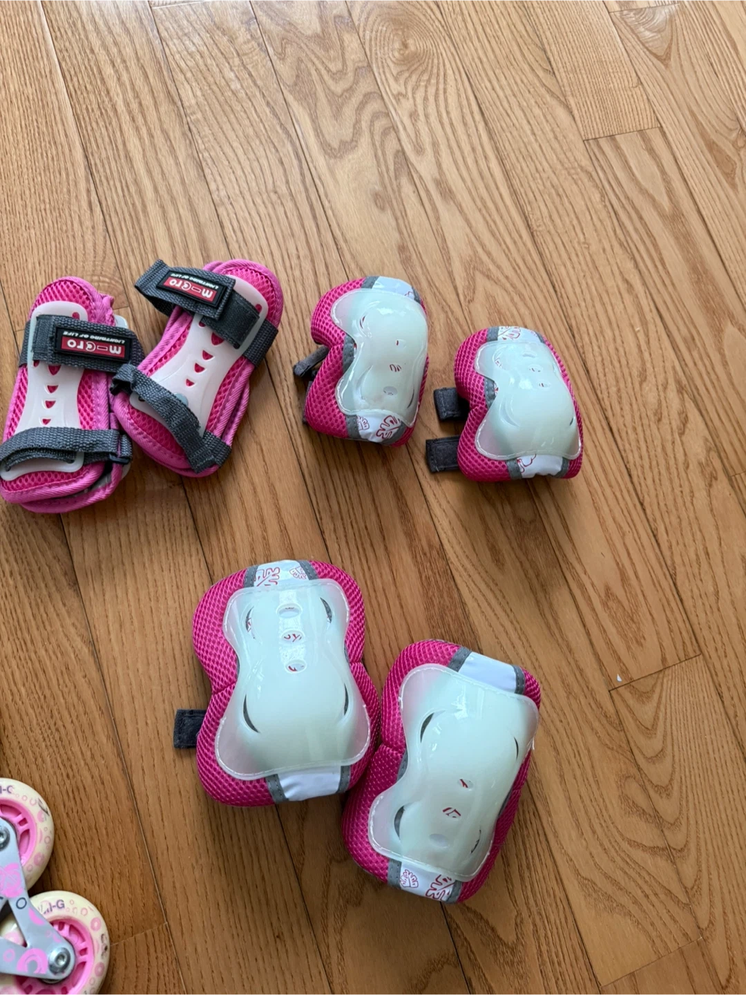 Pink and white rollerblades with adjustable straps and a full set of protective gear including helmets, knee pads, elbow pads, and wrist guards. This set is perfect for young skaters starting out!