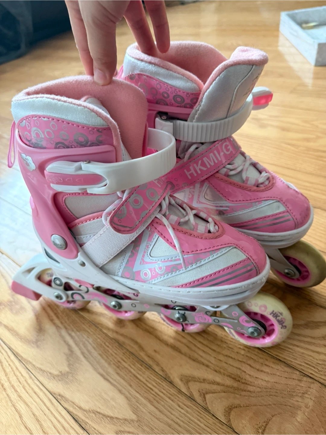 Pink and white rollerblades with adjustable straps and a full set of protective gear including helmets, knee pads, elbow pads, and wrist guards. This set is perfect for young skaters starting out!