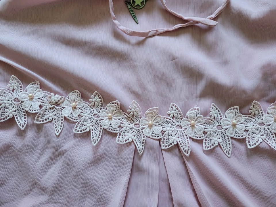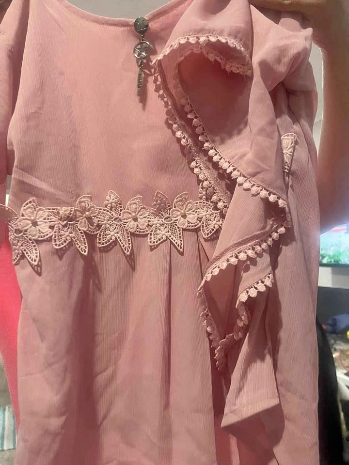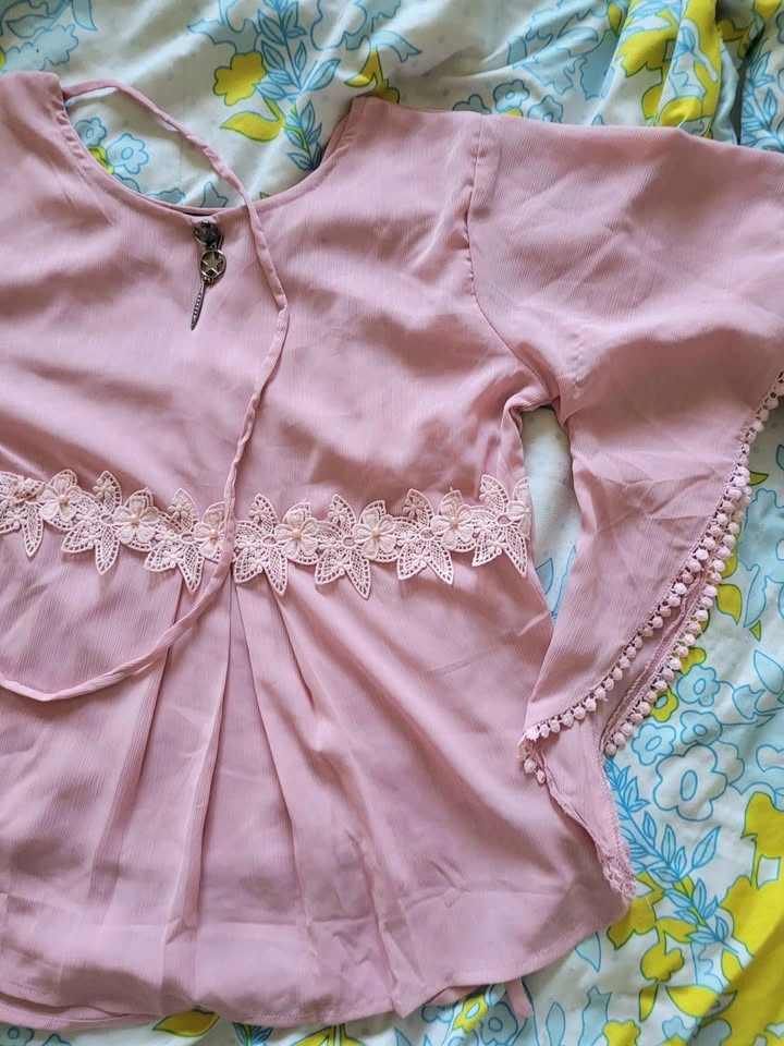 10Casual soft pink color top for women. Half sleeves. Designs on the sleeves. Fit for small to medium sizes. Absolutely new. Smaller for me, never worn. Specifications : Neck - round- neck, loose sleeves like batwing Fabric - cotton mix Type - Peplum Bust size - 18.5 inch Length - 24 inch L size Pickup location: Williams Parkway and Main Street
