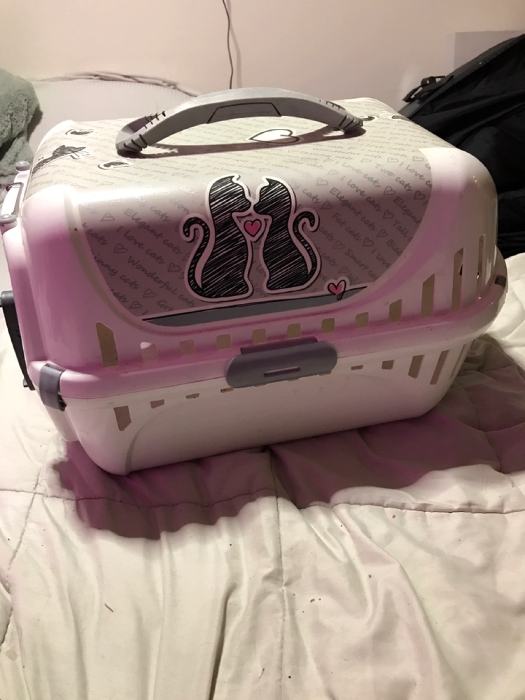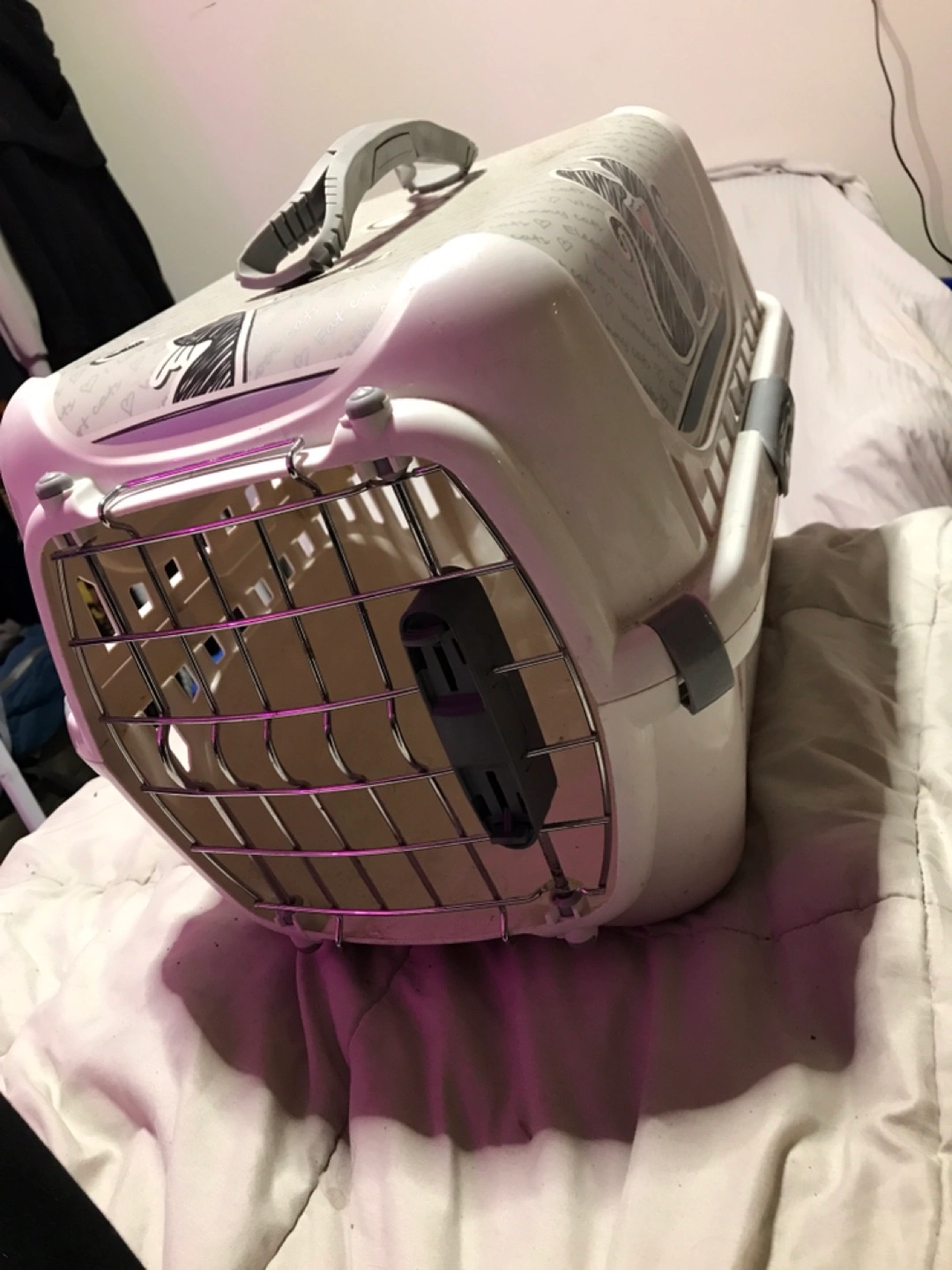 70A cat carrier with a metal wired door. It has a handle on the top. The sides are white with pink accents and decorative prints. It's a comfortable travel option for your furry friend.