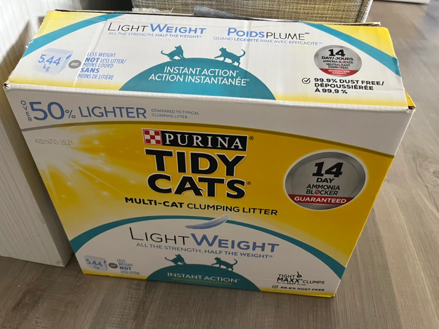96New, more than half of the box left, box of Purina Tidy Cats Lightweight Multi-Cat Clumping Litter. 5.44 kg. Instant action. 99.9% dust free. 14-day ammonia blocker. 50% lighter than typical clumping litter. Cat developed allergy.