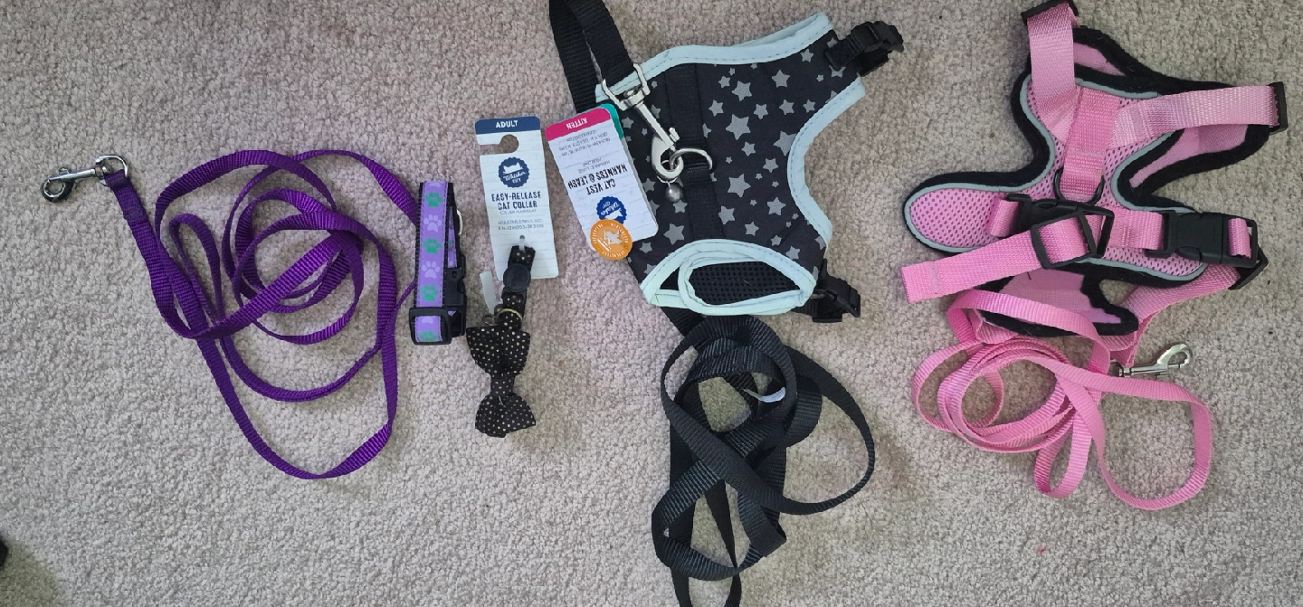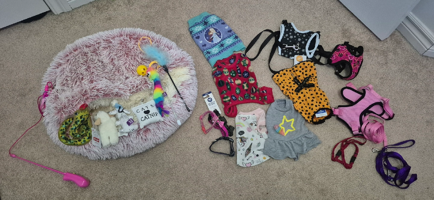 5Selling a bunch of cat accessories! There are collars, harnesses, toys, and even a cozy bed for your furry friend. Perfect for kittens or adult cats, these items are in great condition and ready for a new home