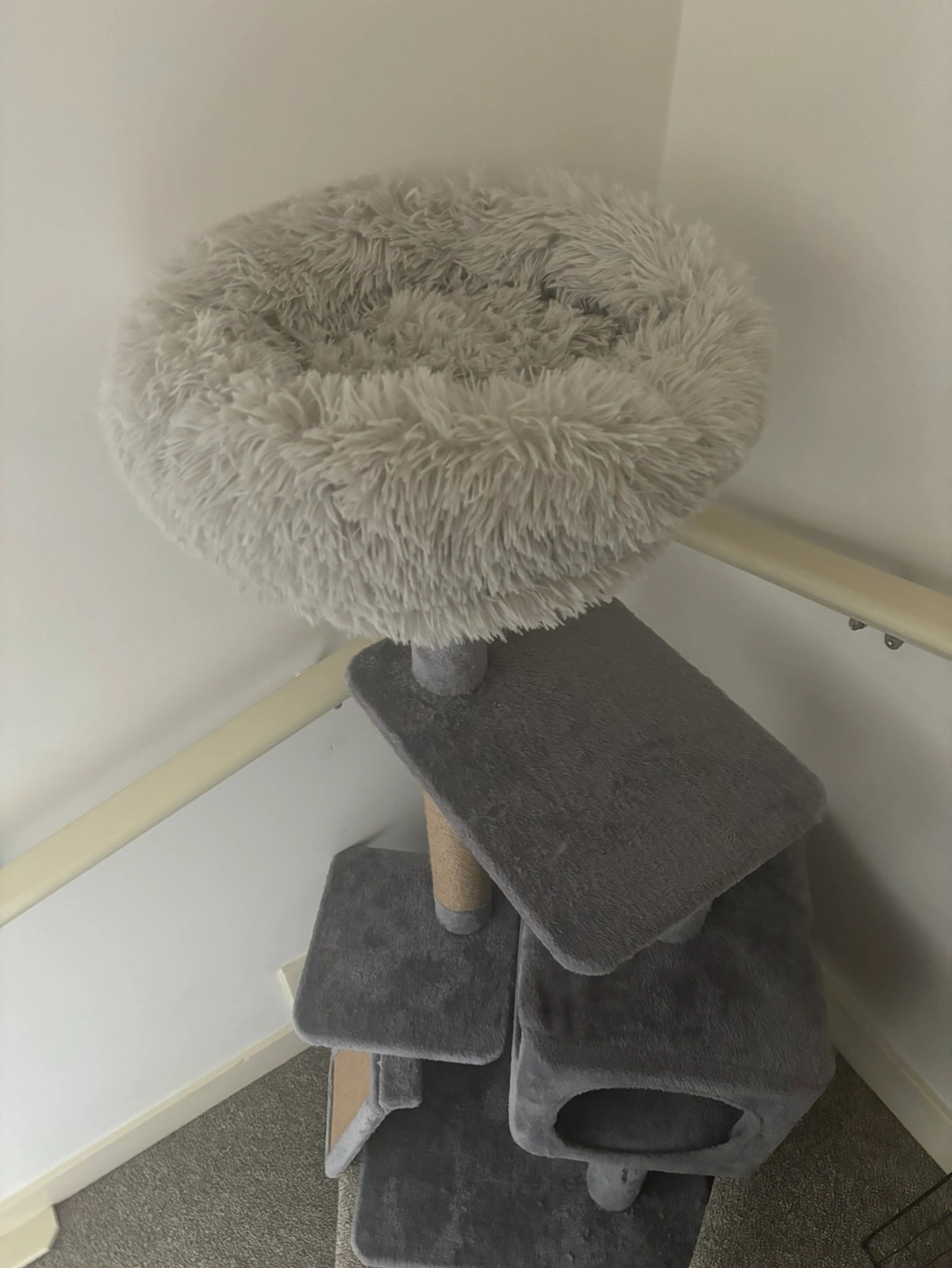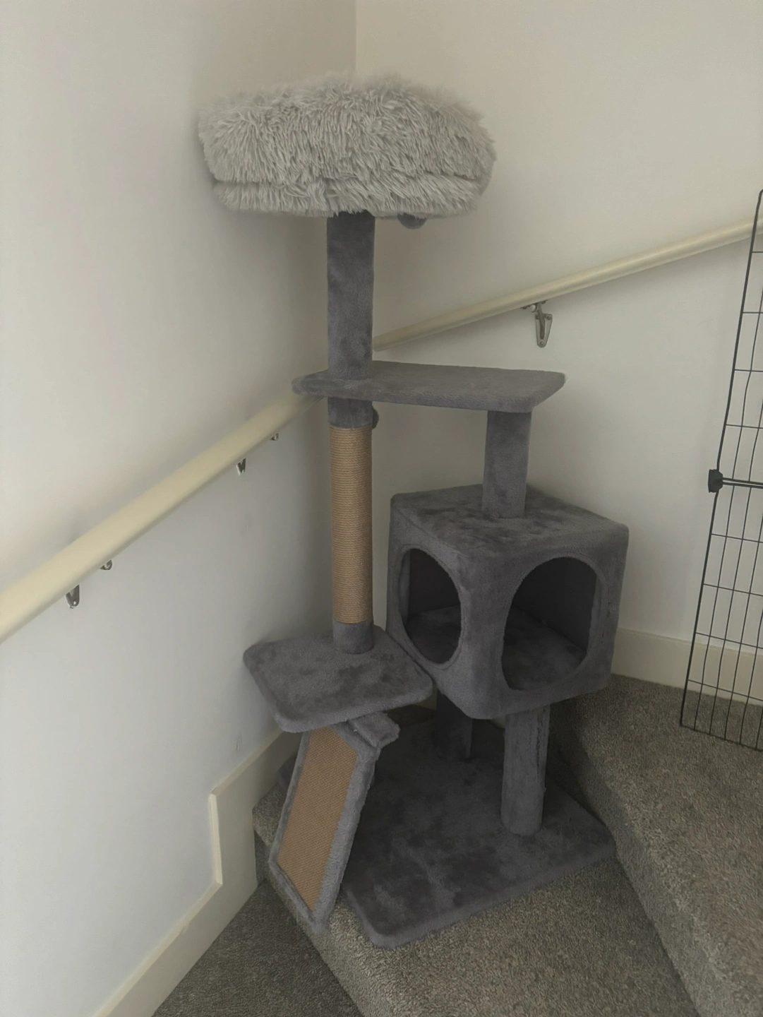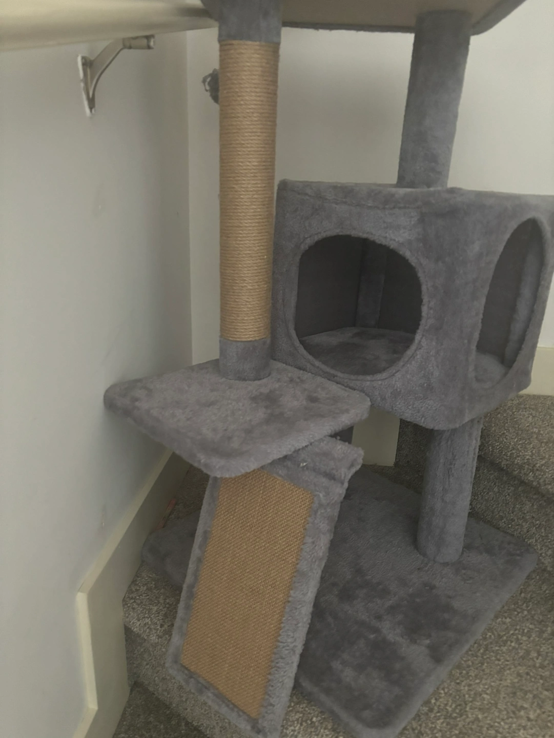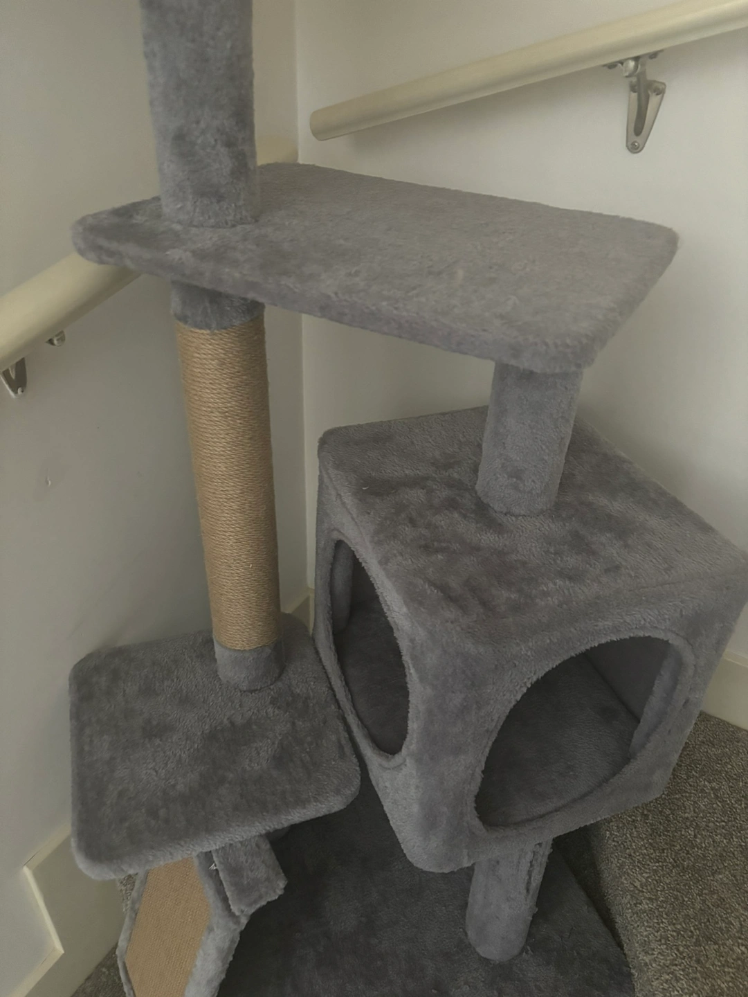 20Grey cat condo with multiple levels, a scratching post and a bed on top.In great condition.