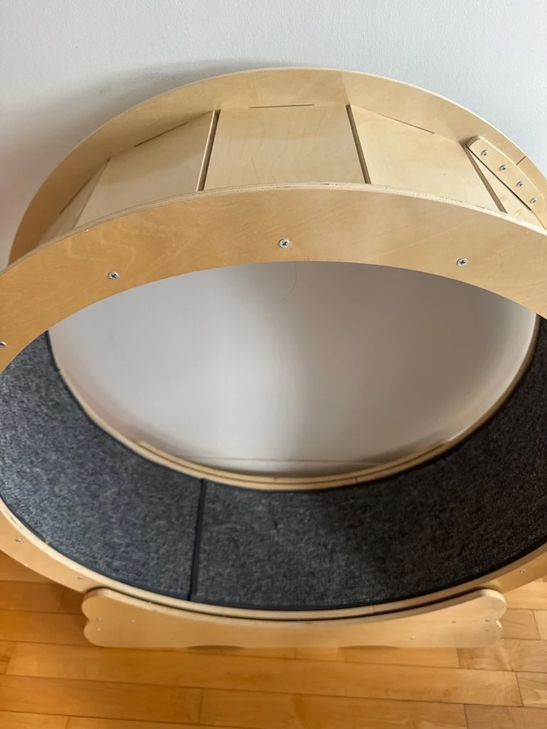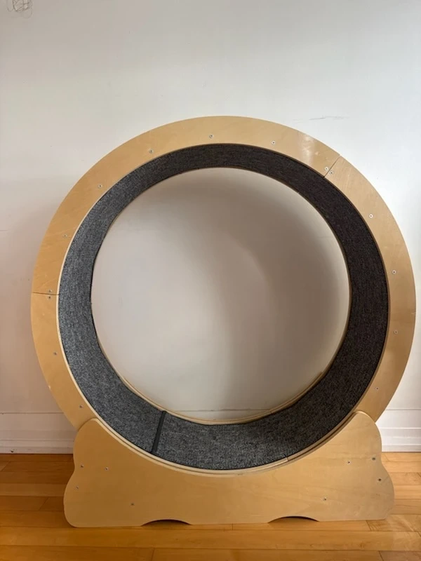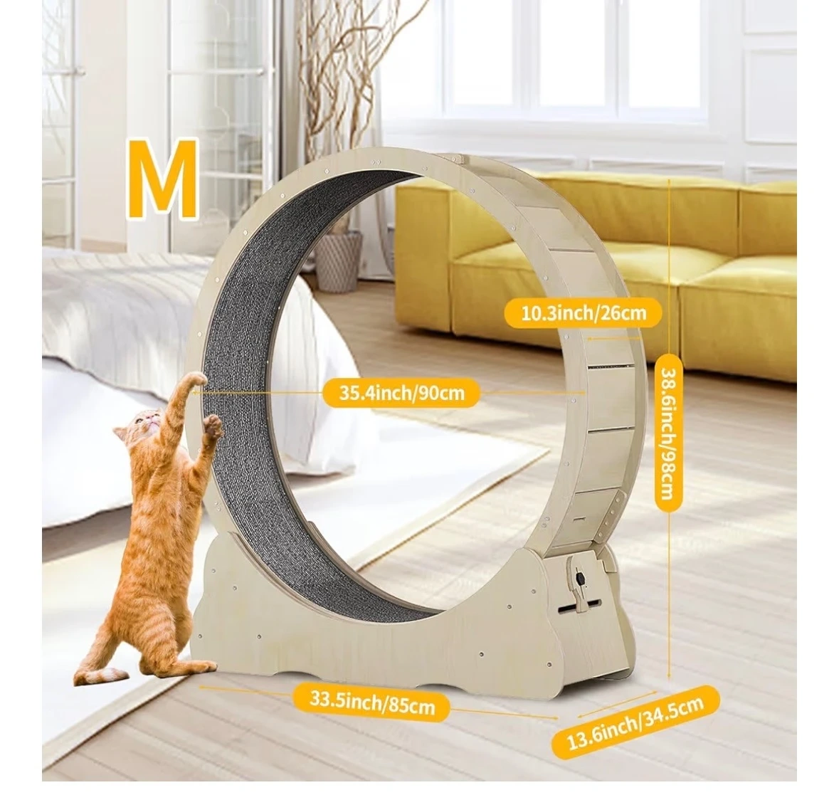 60Looking to keep your kitty active? This cat exercise wheel is a great way to provide enrichment and exercise for your feline friend! It's a size M and in great condition. Dimensions are approximately 35.4 inches (90cm) in diameter and 38.6 inches (98cm) in height. My cat rarely used it.