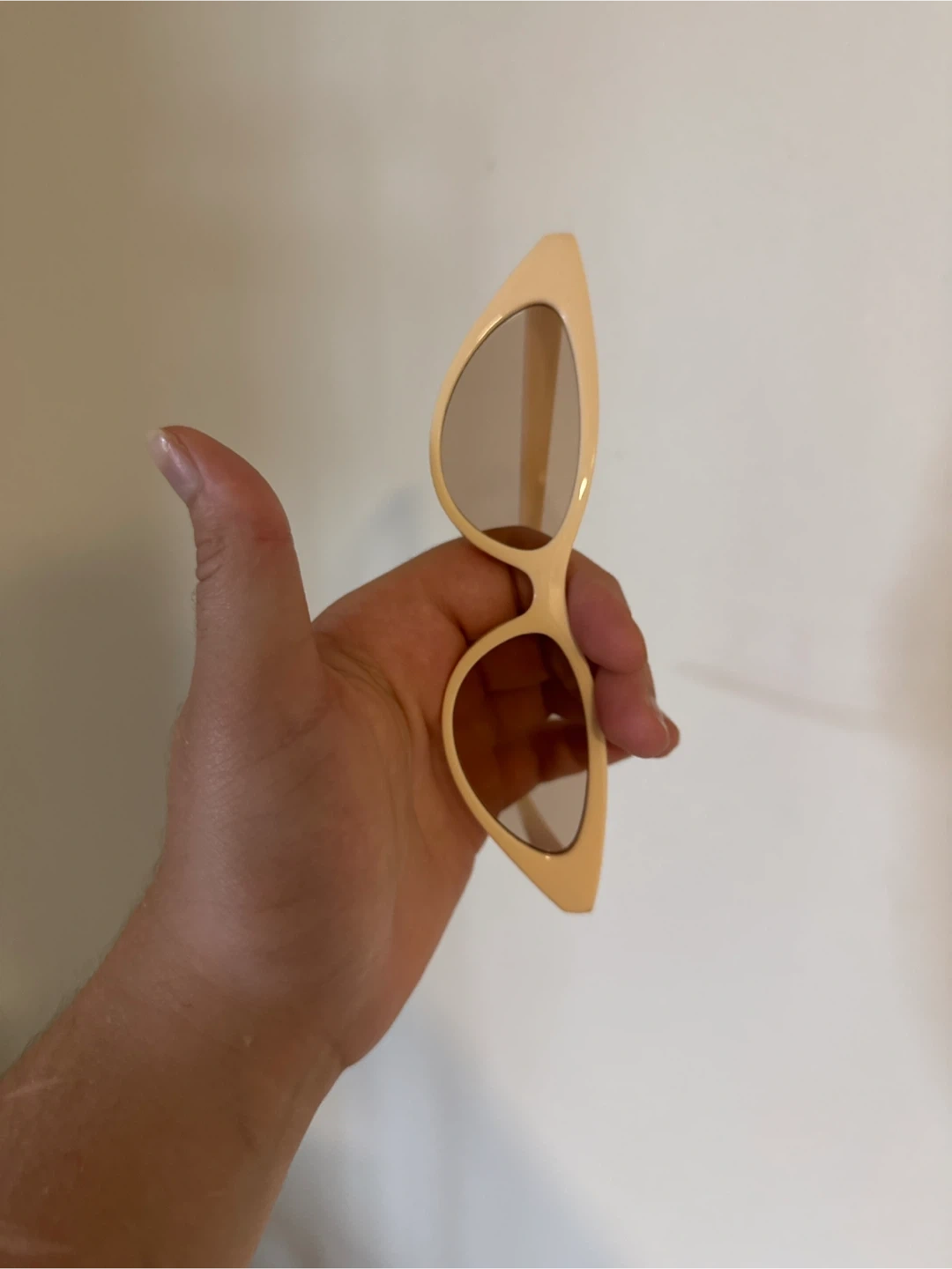 75Selling these stylish cat eye sunglasses. They are a cream colour and in great condition. Perfect for adding a touch of vintage flair to any outfit!
