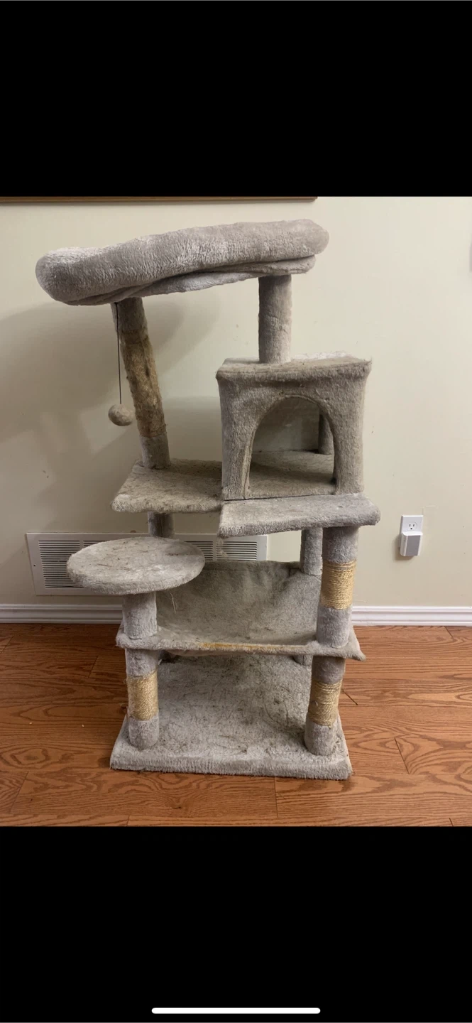 Features: Plush material for napping 5 perches Scratching post Hanging toy This 5-floor big cat tree is the perfect playground for your cat. It is made with strong, high-quality materials, including natural jute rope, so it will last a long time. With five levels of platforms and perches, your cat has a lot of space to play, exercise, and relax. A cozy cat condo gives your cat a private spot to nap. Toy will keep your cat entertained for hours. The high levels help your cat feel confident and less anxious. Its sleek design also makes it easy to fit into your home. • 5-level cat tree offers exercise, play, scratch, and nap spaces. * 5-level cat tree offers exercise, play, scratch, and nap spaces * Made with natural jute rope and teasing toy for added entertainment * Cat condo provides a cozy space for your feline friend to retreat and relax • Allows your cat to easily keep an eye on their environment for greater confidence • Sleek design blends seamlessly with your existing home décor * Allows your cat to easily keep an eye on their environment for greater confidence * Sleek design blends seamlessly with your existing home décor * Suitable for multiple cats or one cat, all lifestages Give your kittens and cat a fun life and their own house! Can be picked up or delivered Cheap - message me