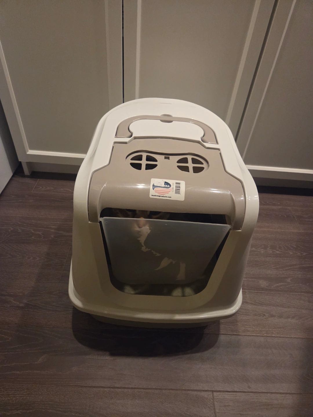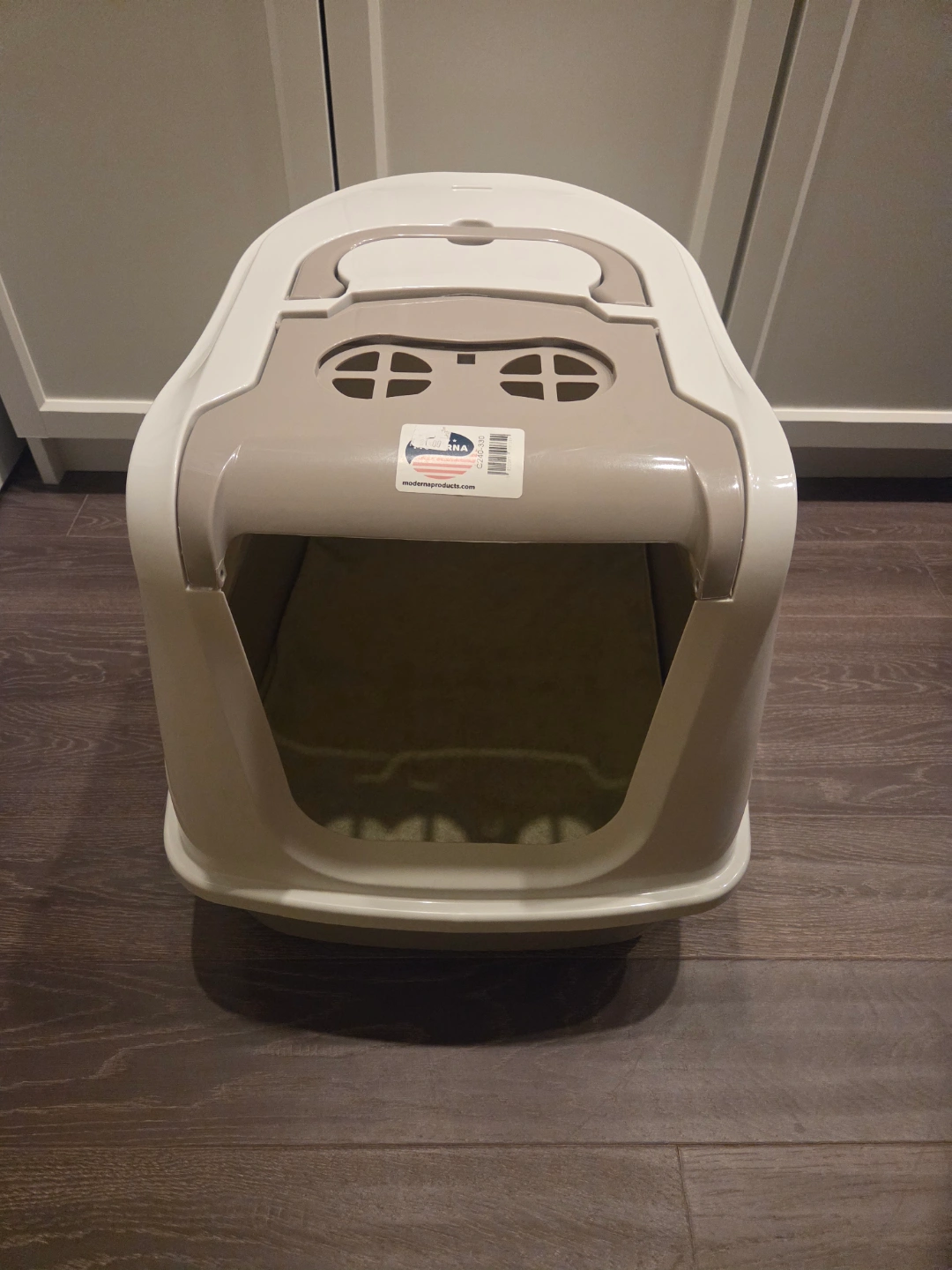 Gently used. Cleaned and sanitized. The rectangular one's size is 22.5"x 16" x 17"H and has removable flap door. $25 The round one's size is 14.5"x18.5", 14.5"H and it's top entry so less ltter trail. Recommend for small size cat less than 5~6 lbs. $30 If you pick up both, $50 for two. Pick up is near Bayview Ave and Hwy7 in Richmond Hill.